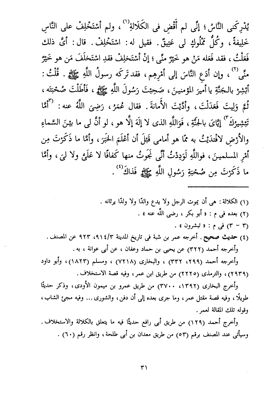 وَإِنْ أَدَعِ النَّاسَ إِلَى أَمْرِهِمْ فَقَدْ تَرَكَهُ رَسُولُ اللهِ صَلَّى الله عَلَيْهِ وَسَلَّمَ، قُلْتُ: أَبْشِرْ بِالْجَنَّةِ يَا أَمِيرَ الْمُؤْمِنِينَ، صَحِبْتَ رَسُولَ اللهِ صَلَّى الله عَلَيْهِ وَسَلَّمَ فَأطَلْتَ صُحْبَتَهُ، ثُمَّ وَلِيتَ فَعَدَلْتَ وَأَدَّيْتَ الأَمَانَةَ، فَقَالَ عُمَرُ رَضِيَ اللهُ عَنْهُ: أَمَّا تَبْشيِرُكَ إِيَّايَ بِالْجَنَّةِ فَوَاللهِ الَّذِي لاَ إِلَهَ إِلاَّ هُوَ لَوْ أَنَّ لِيَ مَا بَيْنَ السَّمَاءِ وَالأَرْضِ لاَفْتَدَيْتُ بِهِ مِمَّا هُوَ أَمَامِي قَبْلَ أَنْ أَعْلَمَ الْخَبَرَ، وَأَمَّا مَا ذَكَرْتَ مِنْ أَمْرِ الْمُسْلِمِينَ فَوَاللهِ لَوَدِدْتُ أَنِّي نَجَوْتُ مِنْهَا كَفَافًا لاَ عَلَيَّ وَلاَ لِيَ، وَأَمَّا مَا ذَكَرْتَ مِنْ صُحْبَةِ رَسُولِ اللهِ صَلَّى الله عَلَيْهِ وَسَلَّمَ فَذَاكَ.