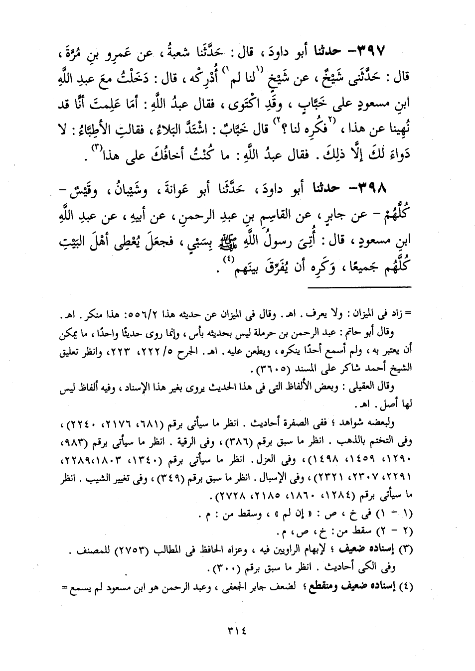 397 - حَدَّثَنَا أَبُو دَاوُدَ قَالَ: حَدَّثَنَا شُعْبَةُ، عَنْ عَمْرِو بْنِ مُرَّةَ، قَالَ: حَدَّثَنِي شَيْخٌ، عَنْ شَيْخٍ، لَنَا لَمْ أُدْرِكْهُ قَالَ: دَخَلْتُ مَعَ عَبْدِ اللَّهِ بْنِ مَسْعُودٍ عَلَى خَبَّابٍ وَقَدِ اكْتَوَى، فَقَالَ عَبْدُ اللَّهِ: «أَمَا عَلِمْتَ أَنَّا قَدْ نُهِينَا عَنْ هَذَا، فَكُرِهَ لَنَا؟» قَالَ خَبَّابٌ: §اشْتَدَّ الْبَلَاءُ فَقَالَتِ الْأَطِبَّاءُ: لَا دَوَاءَ لَكَ إِلَّا ذَلِكَ، فَقَالَ عَبْدُ اللَّهِ: «مَا كُنْتُ أَخَافُكَ عَلَى هَذَا»