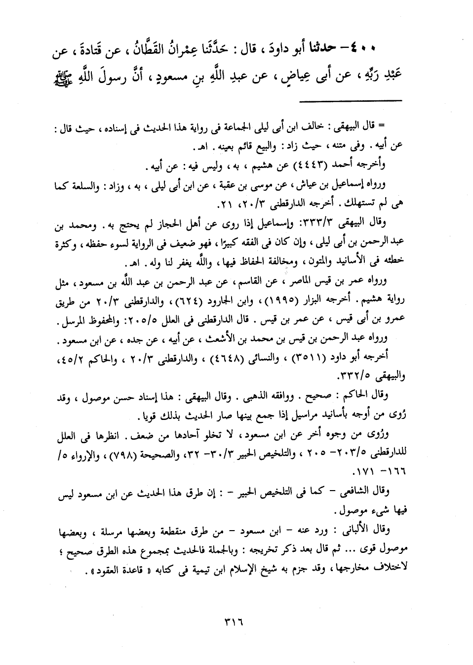 400 - حَدَّثَنَا أَبُو دَاوُدَ قَالَ: حَدَّثَنَا عِمْرَانُ الْقَطَّانُ، عَنْ قَتَادَةَ، عَنْ عَبْدِ رَبِّهِ، عَنْ أَبِي عِيَاضٍ، عَنْ عَبْدِ اللَّهِ بْنِ مَسْعُودٍ، أَنَّ رَسُولَ اللَّهِ صَلَّى اللهُ عَلَيْهِ وَسَلَّمَ -[317]- قَالَ: «§إِيَّاكُمْ وَمُحَقَّرَاتِ الْأَعْمَالِ إِنَّهُنَّ لَيَجْتَمِعْنَ عَلَى الرَّجُلِ حَتَّى يُهْلِكْنَهُ» ، فَإِنَّ رَسُولَ اللَّهِ صَلَّى اللهُ عَلَيْهِ وَسَلَّمَ «ضَرَبَ لَهُنَّ مَثَلًا كَمَثَلِ قَوْمٍ نَزَلُوا بِأَرْضِ فَلَاةٍ فَحَضَرَ صَنِيعُ الْقَوْمِ فَجَعَلَ الرَّجُلُ يَجِيءُ بِالْعُودِ وَالرَّجُلُ يَجِيءُ بِالْعُوَيدِ حَتَّى جَمَعُوا مِنْ ذَلِكَ سَوَادًا ثُمَّ أَجَّجُوا نَارًا فَأَنْضَجَتْ مَا قُذِفَ فِيهَا»