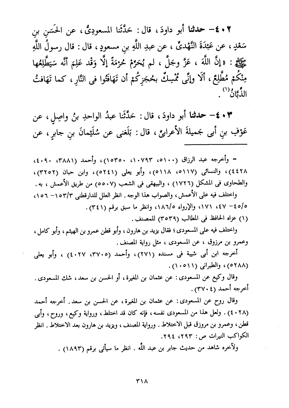 402 - حَدَّثَنَا أَبُو دَاوُدَ قَالَ: حَدَّثَنَا الْمَسْعُودِيُّ، عَنِ الْحَسَنِ بْنِ سَعْدٍ، عَنْ عَبْدَةَ النَّهْدِيِّ، عَنْ عَبْدِ اللَّهِ بْنِ مَسْعُودٍ، قَالَ: قَالَ رَسُولُ اللَّهِ صَلَّى اللهُ عَلَيْهِ وَسَلَّمَ: «إِنَّ §اللَّهَ عَزَّ وَجَلَّ لَمْ يُحَرِّمْ حُرْمَةً إِلَّا وَقَدْ عَلِمَ أَنَّهُ سَيَطَّلِعُهَا مِنْكُمْ مُطَّلِعٌ، أَلَا وَإِنِّي مُمْسِكٌ بِحُجَزِكُمْ أَنْ تَهَافَتُوا فِي النَّارِ كَمَا تَهَافَتُ الذِّبَّانُ»