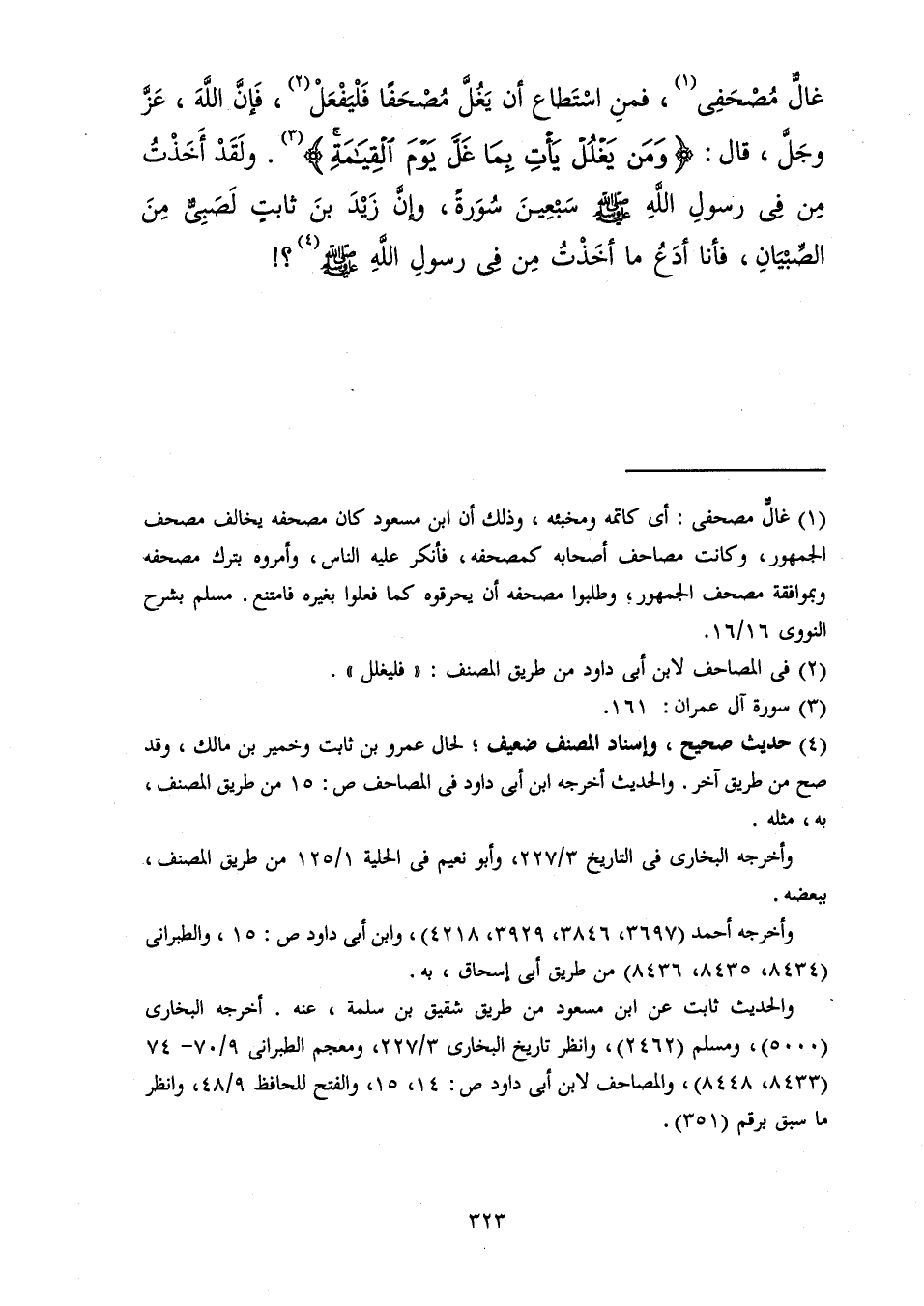 405- حَدَّثَنَا عَمْرُو بْنُ ثَابِتٍ، عَنْ أَبِي إِسْحَاقَ، عَنْ خُمَيْرِ بْنِ مَالِكٍ، قَالَ: سَمِعْتُ ابْنَ مَسْعُودٍ، يَقُولُ: إِنِّي غَالٌّ مُصْحَفِي، فَمَنِ اسْتَطَاعَ أَنْ يَغُلَّ مُصْحَفًا فَلْيَفْعَلْ، فَإِنَّ اللَّهَ عَزَّ وَجَلَّ قَالَ: {وَمَنْ يَغْلُلْ يَأْتِ بِمَا غَلَّ يَوْمَ الْقِيَامَةِ} وَلَقَدْ أَخَذْتُ مِنْ فِي رَسُولِ اللهِ صَلَّى الله عَلَيْهِ وَسَلَّمَ سَبْعِينَ سُورَةً، وَإِنَّ زَيْدَ بْنَ ثَابِتٍ لَصَبِيُّ مِنَ الصِّبْيَانِ، فَأَنَا أَدَعُ مَا أَخَذْتُ مِنْ فِي رَسُولِ اللهِ صَلَّى الله عَلَيْهِ وَسَلَّمَ.