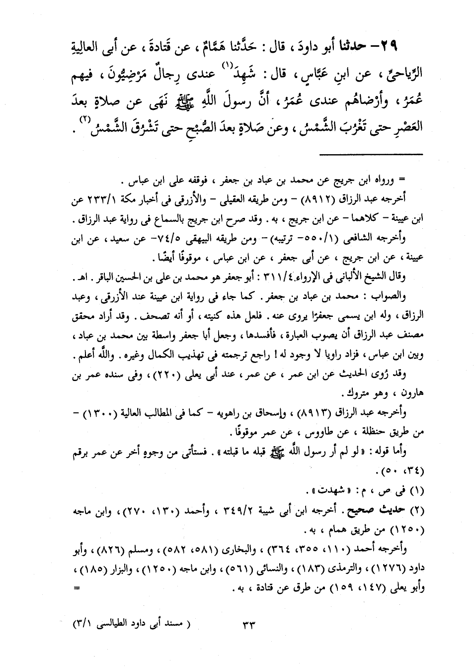 29 - حَدَّثَنَا أَبُو دَاوُدَ قَالَ: حَدَّثَنَا هَمَّامٌ، عَنْ قَتَادَةَ، عَنْ أَبِي الْعَالِيَةِ الرِّيَاحِيِّ، عَنِ ابْنِ عَبَّاسٍ، قَالَ: شَهِدَ عِنْدِي رِجَالٌ مَرْضِيُّونَ فِيهِمْ عُمَرُ وَأَرْضَاهُمْ عِنْدِي عُمَرُ «أَنَّ رَسُولَ اللَّهِ صَلَّى اللهُ عَلَيْهِ وَسَلَّمَ» §نَهَى عَنْ صَلَاةٍ بَعْدَ الْعَصْرِ حَتَّى تَغْرُبَ الشَّمْسُ وَعَنْ صَلَاةٍ بَعْدَ الصُّبْحِ حَتَّى تُشْرِقَ الشَّمْسُ "