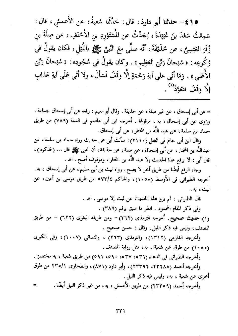 415 - حَدَّثَنَا دَاوُدَ قَالَ: حَدَّثَنَا شُعْبَةُ، عَنِ الْأَعْمَشِ، قَالَ: سَمِعْتُ سَعْدَ بْنَ عُبَيْدَةَ، يُحَدِّثُ عَنِ الْمُسْتَوْرِدِ بْنِ الْأَحْنَفِ، عَنْ صِلَةَ بْنِ زُفَرَ الْعَبْسِيِّ، عَنْ حُذَيْفَةَ، أَنَّهُ صَلَّى مَعَ النَّبِيِّ صَلَّى اللهُ عَلَيْهِ وَسَلَّمَ بِاللَّيْلِ فَكَانَ §يَقُولُ فِي رُكُوعِهِ: «سُبْحَانَ رَبِّيَ الْعَظِيمِ» ، وَكَانَ يَقُولُ فِي سُجُودِهِ: «سُبْحَانَ رَبِّيَ الْأَعْلَى» ، وَمَا أَتَى عَلَى آيَةِ رَحْمَةٍ إِلَّا وَقَفَ فَسَأَلَ وَلَا أَتَى عَلَى آيَةِ عَذَابٍ إِلَّا وَقَفَ فَتَعَوَّذَ