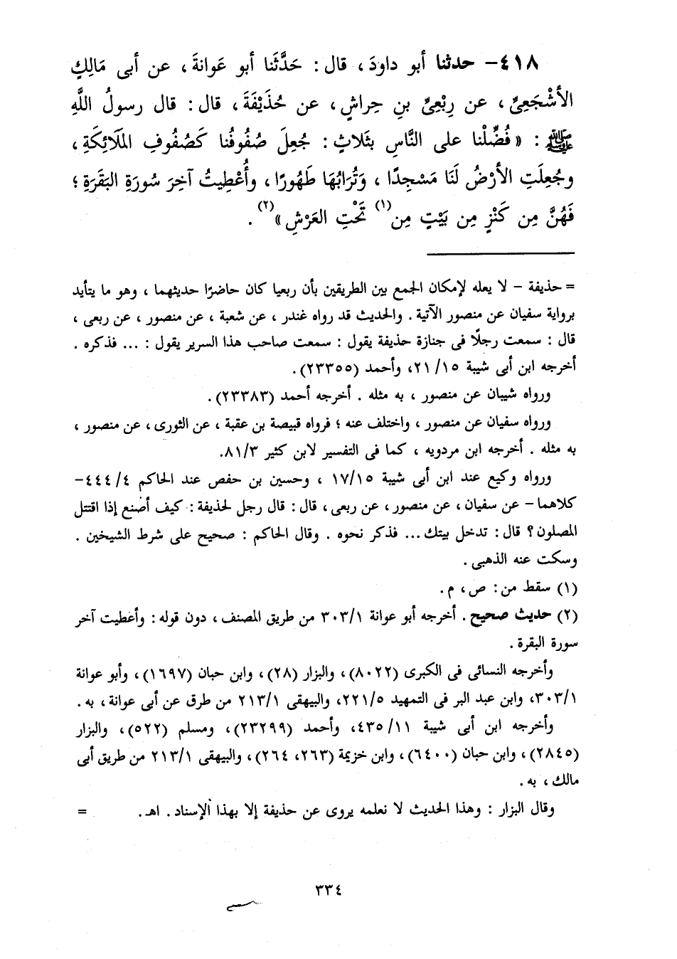 418 - حَدَّثَنَا أَبُو دَاوُدَ قَالَ: حَدَّثَنَا أَبُو عَوَانَةَ، عَنْ أَبِي مَالِكٍ الْأَشْجَعِيِّ، عَنْ رِبْعِيِّ بْنِ حِرَاشٍ، عَنْ حُذَيْفَةَ، قَالَ: قَالَ رَسُولُ اللَّهِ صَلَّى اللهُ عَلَيْهِ وَسَلَّمَ: " §فُضِّلْنَا عَلَى النَّاسِ بِثَلَاثٍ: جُعِلَ صُفُوفُنَا كَصُفُوفِ الْمَلَائِكَةِ وَجُعِلَتْ الْأَرْضُ لَنَا مَسْجِدًا وَتُرَابُهَا طَهُورًا، وَأُعْطِيتُ آخِرَ سُورَةِ الْبَقَرَةِ فَهُنَّ مِنْ كَنْزٍ مِنْ بَيْتٍ مِنْ تَحْتِ الْعَرْشِ "