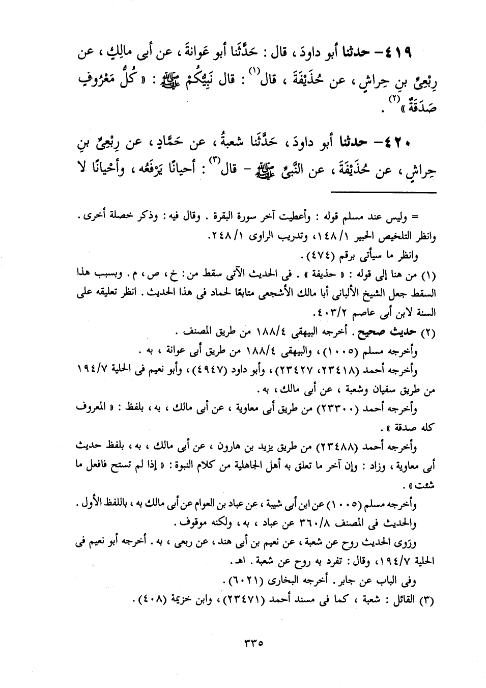 419 - حَدَّثَنَا أَبُو دَاوُدَ قَالَ: حَدَّثَنَا أَبُو عَوَانَةَ، عَنْ أَبِي مَالِكٍ، عَنْ رِبْعِيِّ بْنِ حِرَاشٍ، عَنْ حُذَيْفَةَ، قَالَ: قَالَ نَبِيُّكُمْ صَلَّى اللهُ عَلَيْهِ وَسَلَّمَ: «§كُلُّ مَعْرُوفٍ صَدَقَةٌ»