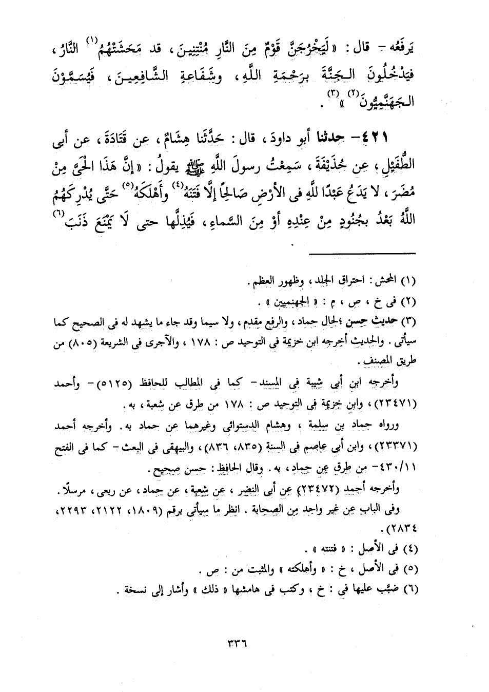 421 - حَدَّثَنَا أَبُو دَاوُدَ قَالَ: حَدَّثَنَا هِشَامٌ، عَنْ قَتَادَةَ، عَنْ أَبِي الطُّفَيْلِ، عَنْ حُذَيْفَةَ، سَمِعْتُ رَسُولَ اللَّهِ صَلَّى اللهُ عَلَيْهِ وَسَلَّمَ يَقُولُ: «إِنَّ §هَذَا الْحَيَّ مِنْ مُضَرَ لَا يَدَعُ عَبْدًا لِلَّهِ فِي الْأَرْضِ صَالِحًا إِلَّا فَتَنَهُ وَأَهْلَكَهُ حَتَّى يُدْرِكَهُمُ اللَّهُ بَعْدُ بِجُنُودٍ مِنْ عِنْدِهِ أَوْ مِنَ السَّمَاءِ فَيُذِلَّهَا حَتَّى لَا يَمْنَعَ ذَنَبَ -[337]- تَلْعَةٍ»