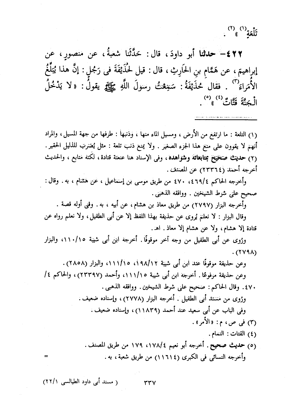 422 - حَدَّثَنَا أَبُو دَاوُدَ قَالَ: حَدَّثَنَا شُعْبَةُ، عَنْ مَنْصُورٍ، عَنْ إِبْرَاهِيمَ، عَنْ هَمَّامِ بْنِ الْحَارِثِ، قَالَ: قِيلَ لِحُذَيْفَةَ فِي رَجُلٍ: إِنَّ هَذَا يُبَلِّغُ الْأُمَرَاءَ فَقَالَ حُذَيْفَةُ: سَمِعْتُ رَسُولَ اللَّهِ صَلَّى اللهُ عَلَيْهِ وَسَلَّمَ يَقُولُ: «§لَا يَدْخُلُ الْجَنَّةَ قَتَّاتٌ»