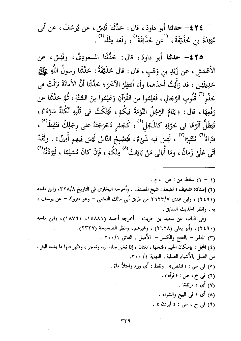 425 - حَدَّثَنَا أَبُو دَاوُدَ قَالَ: حَدَّثَنَا الْمَسْعُودِيُّ، وَقَيْسٌ، عَنِ الْأَعْمَشِ، عَنْ زَيْدِ بْنِ وَهْبٍ، قَالَ: قَالَ حُذَيْفَةُ: حَدَّثَنَا رَسُولُ اللَّهِ صَلَّى اللهُ عَلَيْهِ وَسَلَّمَ حَدِيثَيْنِ قَدْ رَأَيْتُ أَحَدَهُمَا وَأَنَا أَنْتَظِرُ الْآخَرَ حَدَّثَنَا: «إِنَّ §الْأَمَانَةَ نَزَلَتْ فِي جَذْرِ قُلُوبِ الرِّجَالِ فَعَلِمُوا مِنَ الْقُرْآنِ وَعَلِمُوا مِنَ السُّنَّةِ» ، ثُمَّ حَدَّثَنَا عَنْ رَفْعِهَا قَالَ: " يَنَامُ الرَّجُلُ النَّوْمَةَ فِيكُمْ فَيُنْكَتُ فِي قَلْبِهِ نُكْتَةٌ سَوْدَاءُ فَيَظَلُّ أَثَرُهَا فِي جَوْفِهِ كَالْمَجْلِ كَجَمْرٍ دَحْرَجْتَهُ عَلَى رِجْلَكَ فَنَفِطَ فَتَرَاهُ مُنْتَبِرًا لَيْسَ فِيهِ شَيْءٌ فَيُصْبِحُ النَّاسُ لَيْسَ فِيهِمْ أَمِينٌ، وَلَقَدْ أَتَى عَلَيَّ زَمَانٌ وَمَا أُبَالِي مَنْ بَايَعْتُ مِنْكُمْ، فَإِنْ كَانَ مُسْلِمًا لَيَرُدَّنَّهُ -[340]- عَلَيَّ إِسْلَامُهُ، وَإِنْ كَانَ يَهُودِيًّا أَوْ نَصْرَانِيًّا لَيَرُدَّنَّهُ عَلَيَّ سَاعِيهِ، وَلَقَدْ أَصْبَحْتُ فِيكُمْ مَا أُبَايِعُ مِنْكُمْ إِلَّا فُلَانًا وَفُلَانًا، وَلَيَأْتِيَنَّ عَلَى النَّاسِ زَمَانٌ يُقَالُ لِلرَّجُلِ فِيهِ: مَا أَظْرَفَهُ وَمَا أَعْقَلَهُ، وَمَا فِي قَلْبِهِ مِنَ الْإِيمَانِ مِثْقَالُ شَعِيرَةٍ "