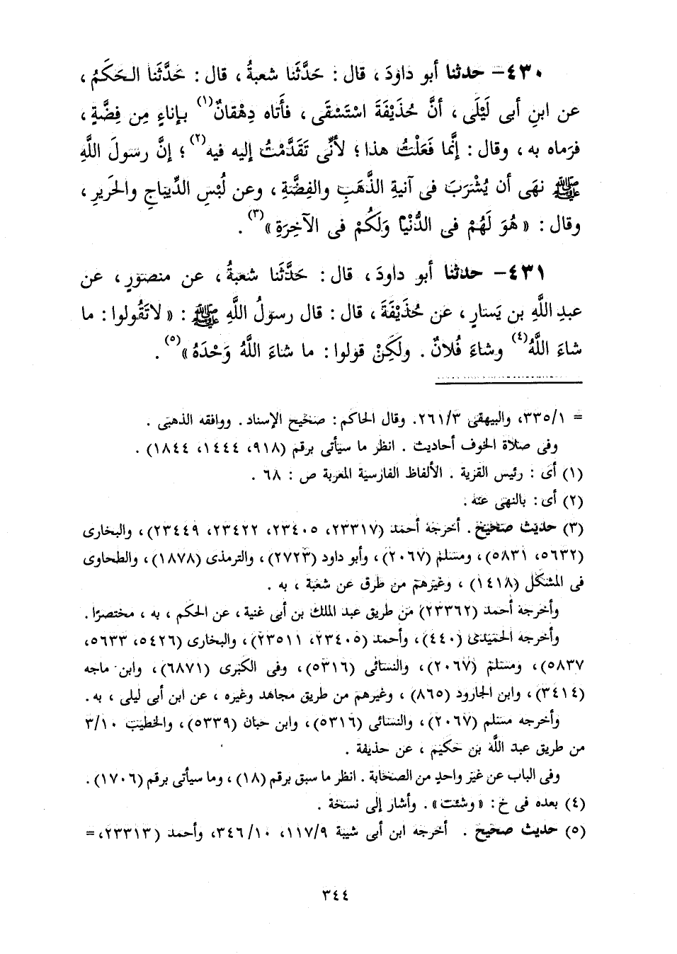 430 - حَدَّثَنَا دَاوُدَ قَالَ: حَدَّثَنَا شُعْبَةُ، قَالَ: حَدَّثَنَا الْحَكَمُ، عَنِ ابْنِ أَبِي لَيْلَى، أَنَّ حُذَيْفَةَ، اسْتَسْقَى فَأَتَاهُ دِهْقَانٌ بِإِنَاءٍ مِنْ فِضَّةٍ فَرَمَاهُ بِهِ وَقَالَ: إِنَّمَا فَعَلْتَ هَذَا لِأَنِّي تَقَدَّمْتُ إِلَيْهِ فِيهِ، إِنَّ رَسُولَ اللَّهِ صَلَّى اللهُ عَلَيْهِ وَسَلَّمَ §نَهَى أَنْ يُشْرَبَ فِي آنِيَةِ الذَّهَبِ وَالْفِضَّةِ وَعَنْ لُبْسِ الدِّيبَاجِ وَالْحَرِيرِ وَقَالَ: «هُوَ لَهُمْ فِي الدُّنْيَا وَلَكُمْ فِي الْآخِرَةِ»