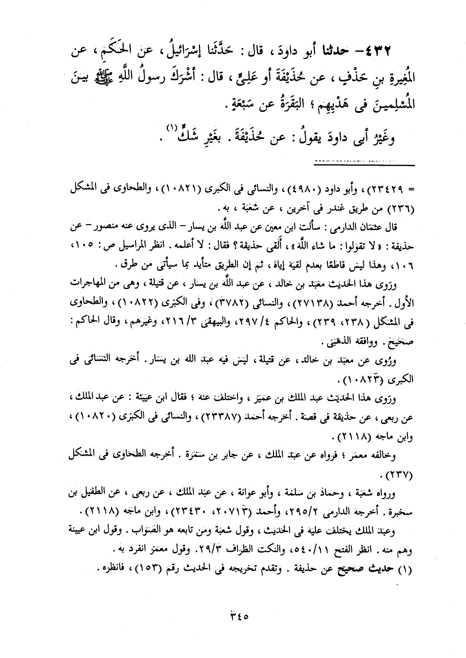 432 - حَدَّثَنَا أَبُو دَاوُدَ قَالَ: حَدَّثَنَا إِسْرَائِيلُ، عَنِ الْحَكَمِ، عَنِ الْمُغِيرَةِ بْنِ حَذْفٍ، عَنْ حُذَيْفَةَ، أَوْ عَلِيٍّ قَالَ: " أَشْرَكَ رَسُولُ اللَّهِ صَلَّى اللهُ عَلَيْهِ وَسَلَّمَ بَيْنَ الْمُسْلِمِينَ فِي هَدْيِهِمُ: §الْبَقَرَةُ عَنْ سَبْعَةٍ " وَغَيْرُ أَبِي دَاوُدَ يَقُولُ: عَنْ حُذَيْفَةَ بِغَيْرِ شَكٍّ