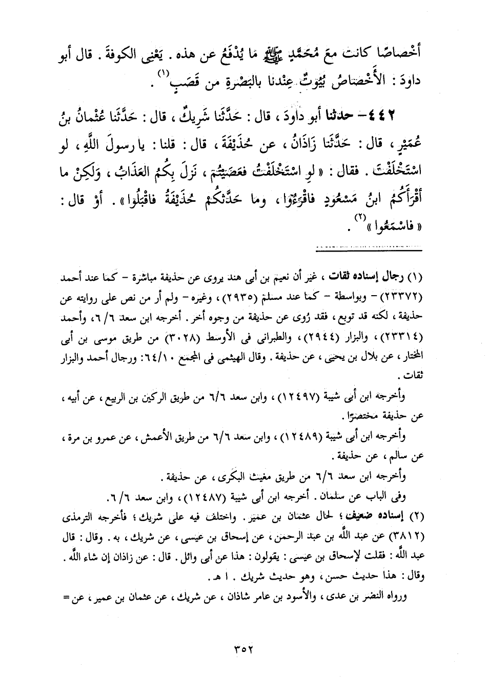 442 - حَدَّثَنَا أَبُو دَاوُدَ قَالَ: حَدَّثَنَا شَرِيكٌ، قَالَ: حَدَّثَنَا عُثْمَانُ بْنُ عُمَيْرٍ، قَالَ: حَدَّثَنَا زَاذَانُ، عَنْ حُذَيْفَةَ، قَالَ: قُلْنَا: يَا رَسُولَ اللَّهِ لَوِ اسْتَخْلَفْتَ فَقَالَ: «§لَوِ اسْتَخْلَفْتُ فَعَصَيْتُمْ نَزَلَ بِكُمُ الْعَذَابُ وَلَكِنْ مَا أَقْرَأَكُمُ ابْنُ مَسْعُودٍ فَاقْرَءُوا وَمَا حَدَّثَكُمْ حُذَيْفَةُ فَاقْبَلُوا» ، أَوْ قَالَ: «فَاسْمَعُوا»
