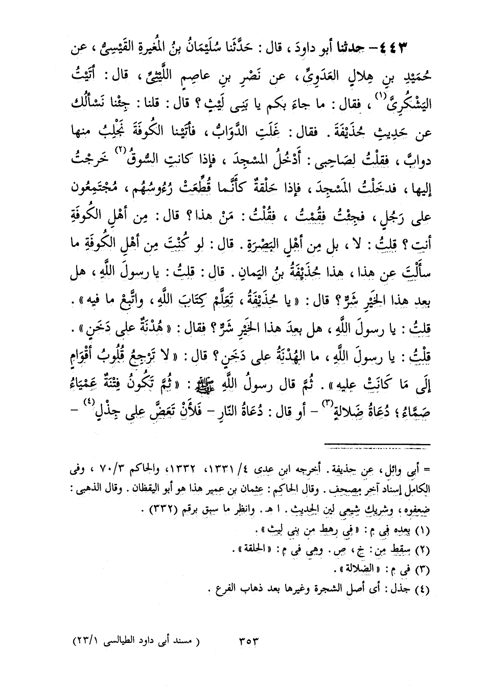 443 - حَدَّثَنَا أَبُو دَاوُدَ قَالَ: حَدَّثَنَا سُلَيْمَانُ بْنُ الْمُغِيرَةِ الْقَيْسِيُّ، عَنْ حُمَيْدِ بْنِ هِلَالٍ الْعَدَوِيِّ، عَنْ نَصْرِ بْنِ عَاصِمٍ اللَّيْثِيِّ، قَالَ: أَتَيْتُ الْيَشْكُرِيَّ فَقَالَ: مَا جَاءَ بِكُمْ يَا بَنِي لَيْثٍ؟ قَالَ: قُلْنَا: جِئْنَا نَسْأَلُكَ عَنْ حَدِيثِ حُذَيْفَةَ فَقَالَ: غَلَتِ الدَّوَابُّ فَأَتَيْنَا الْكُوفَةَ نَجْلِبُ مِنْهَا دَوَابَّ فَقُلْتُ لِصَاحِبِي: أَدْخُلُ الْمَسْجِدَ فَإِذَا كَانَتِ السُّوقُ خَرَجْتُ إِلَيْهَا فَدَخَلْتُ الْمَسْجِدَ فَإِذَا حَلْقَةٌ كَأَنَّمَا قُطِّعَتْ رُءُوسُهُمْ مُجْتَمِعُونَ عَلَى رَجُلٍ فَجِئْتُ فَقُمْتُ فَقُلْتُ: مَنْ هَذَا؟ قَالَ: مِنْ أَهْلِ الْكُوفَةِ أَنْتَ؟ قُلْتُ: لَا بَلْ مِنْ أَهْلِ الْبَصْرَةِ قَالَ: لَوْ كُنْتَ مِنْ أَهْلِ الْكُوفَةِ مَا سَأَلْتَ عَنْ هَذَا، هَذَا حُذَيْفَةُ بْنُ الْيَمَانِ قَالَ: قُلْتُ: يَا رَسُولَ اللَّهِ §هَلْ بَعْدَ هَذَا الْخَيْرِ شَرٌّ؟ قَالَ: «يَا حُذَيْفَةُ تَعَلَّمْ كِتَابَ اللَّهِ وَاتَّبِعْ مَا فِيهِ» ، قُلْتُ: يَا رَسُولَ اللَّهِ هَلْ بَعْدَ هَذَا الْخَيْرِ شَرٌّ؟ فَقَالَ: «هُدْنَةٌ عَلَى دَخَنٍ» ، قُلْتُ: يَا رَسُولَ اللَّهِ مَا الْهُدْنَةُ عَلَى دَخَنٍ؟ قَالَ: «لَا تَرْجِعُ قُلُوبُ أَقْوَامٍ إِلَى مَا كَانَتْ عَلَيْهِ» ، ثُمَّ قَالَ رَسُولُ اللَّهِ صَلَّى اللهُ عَلَيْهِ وَسَلَّمَ: «ثُمَّ تَكُونُ فِتْنَةٌ عَمْيَاءُ صَمَّاءُ دُعَاةُ ضَلَالَةٍ أَوْ قَالَ دُعَاةُ النَّارِ فَلَأَنْ تَعَضَّ عَلَى جِذْلٍ -[354]- يَعْنِي شَجَرَةً - خَيْرٌ لَكَ مِنْ أَنْ تَتْبَعَ أَحَدًا مِنْهُمْ»