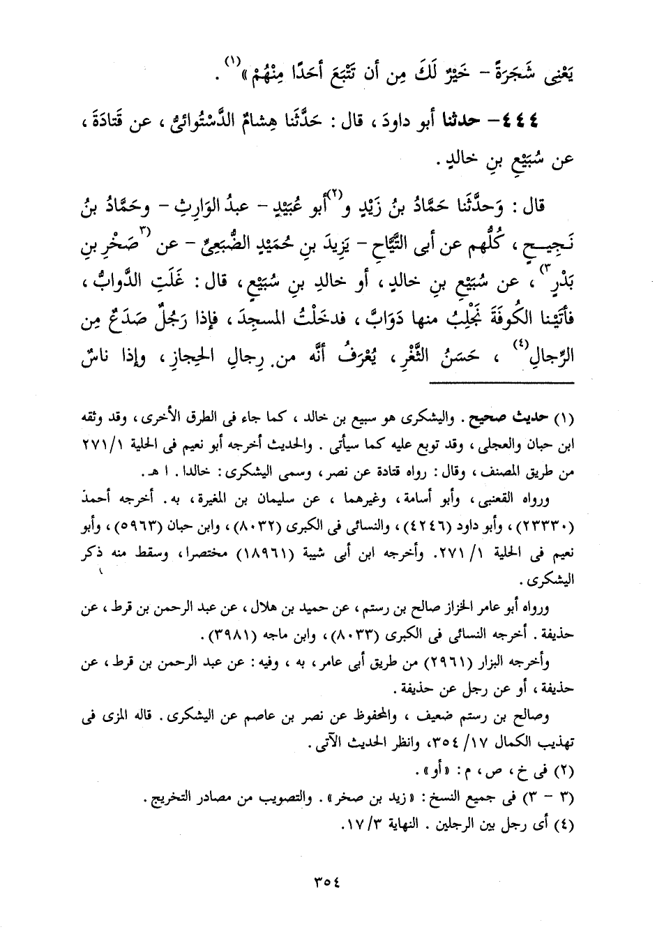 444 - حَدَّثَنَا أَبُو دَاوُدَ قَالَ: حَدَّثَنَا هِشَامٌ الدَّسْتُوَائِيُّ، عَنْ قَتَادَةَ، عَنْ سُبَيْعِ بْنِ خَالِدٍ، قَالَ: وَحَدَّثَنَا حَمَّادُ بْنُ زَيْدٍ وَأَبُو عُبَيْدٍ عَبْدُ الْوَارِثِ وَحَمَّادُ بْنُ نَجِيحٍ كُلُّهُمْ عَنْ أَبِي التَّيَّاحِ يَزِيدَ بْنِ حُمَيْدٍ الضُّبَعِيِّ، عَنْ صَخْرٍ بْنِ بَدْرٍ، عَنْ سُبَيْعِ بْنِ خَالِدٍ أَوْ خَالِدِ بْنِ سُبَيْعٍ قَالَ: غَلَتِ الدَّوَابُّ فَأَتَيْنَا الْكُوفَةَ نَجْلِبُ مِنْهَا دَوَابَّ فَدَخَلْتُ الْمَسْجِدَ فَإِذَا رَجُلٌ صَدَعٌ مِنَ الرِّجَالِ حَسَنُ الثَّغْرِ يُعْرَفُ أَنَّهُ مِنْ رِجَالِ الْحِجَازِ وَإِذَا نَاسٌ -[355]- مُشْرَئِبُّونَ عَلَيْهِ فَقَالَ: لَا تَعْجَلُوا عَلَيَّ أُحَدِّثْكُمْ، فَإِنَّا كُنَّا حَدِيثَ عَهْدٍ بِجَاهِلِيَّةٍ فَلَمَّا جَاءَ الْإِسْلَامُ فَإِذَا أَمْرٌ لَمْ أَرَ قَبْلَهُ مِثْلَهُ وَكَانَ اللَّهُ رَزَقَنِي فَهْمًا فِي الْقُرْآنِ وَكَانَ النَّاسُ يَسْأَلُونَ رَسُولَ اللَّهِ صَلَّى اللهُ عَلَيْهِ وَسَلَّمَ عَنِ الْخَيْرِ وَأَسْأَلُهُ عَنِ الشَّرِّ فَقُلْتُ: يَا رَسُولَ اللَّهِ §هَلْ بَعْدَ هَذَا الْخَيْرِ شَرٌّ كَمَا كَانَ قَبْلَهُ شَرٌّ؟ قَالَ: «نَعَمْ» ، قُلْتُ: فَمَا الْعِصْمَةُ يَا رَسُولَ اللَّهِ؟ قَالَ: «السَّيْفُ» ، قُلْتُ: فَهَلْ لِلسَّيْفِ مِنْ بَقِيَّةٍ؟ فَمَا يَكُونُ بَعْدَهُ؟ قَالَ: «تَكُونُ هُدْنَةٌ عَلَى دَخَنٍ» ، قَالَ: قُلْتُ: فَمَا يَكُونُ بَعْدَ الْهُدْنَةِ؟ قَالَ: «دُعَاةُ الضَّلَالَةِ فَإِنْ رَأَيْتَ يَوْمَئِذٍ لِلَّهِ عَزَّ وَجَلَّ فِي الْأَرْضِ خَلِيفَةً فَالْزَمْهُ وَإِنْ ضَرَبَ ظَهْرَكَ وَأَخَذَ مَالَكَ وَإِنْ لَمْ تَرَ خَلِيفَةً فَاهْرُبْ حَتَّى يُدْرِكَكَ الْمَوْتُ وَأَنْتَ عَاضٌّ عَلَى جِذْلِ شَجَرَةٍ» ، قُلْتُ: يَا رَسُولَ اللَّهِ فَمَا يَكُونُ بَعْدَ ذَلِكَ؟ قَالَ: «الدَّجَّالُ»