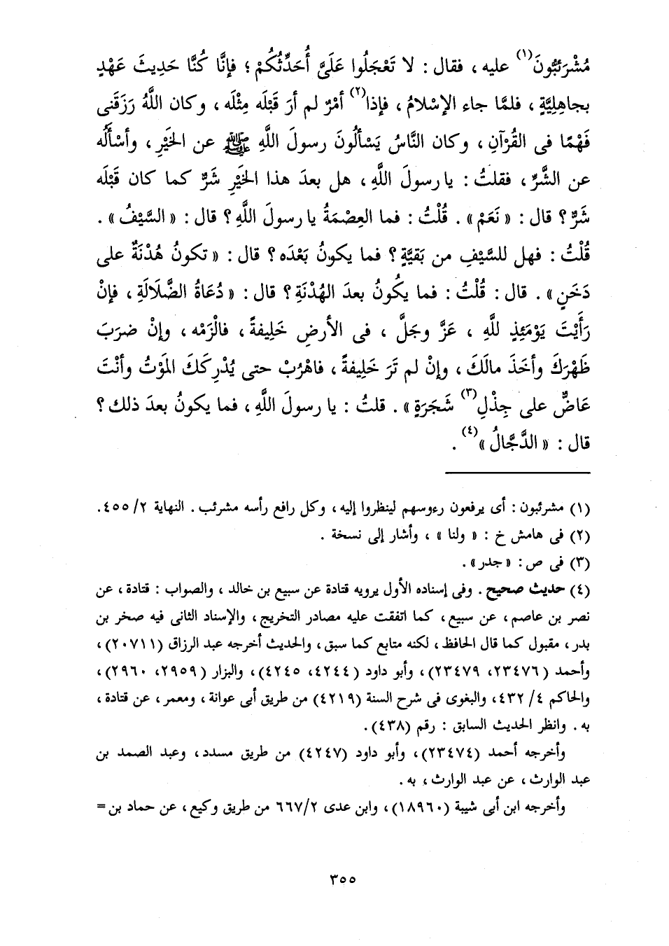 وَكَانَ النَّاسُ يَسْأَلُونَ رَسُولَ اللهِ صَلَّى الله عَلَيْهِ وَسَلَّمَ عَنِ الْخَيْرِ وَأَسْأَلُهُ عَنِ الشَّرِّ، فَقُلْتُ: يَا رَسُولَ اللهِ، هَلْ بَعْدَ هَذَا الْخَيْرِ شَرٌّ، كَمَا كَانَ قَبْلَهُ شَرٌّ؟ قَالَ: نَعَمْ، قُلْتُ: فَمَا الْعِصْمَةُ يَا رَسُولَ اللهِ؟ قَالَ: السَّيْفُ، قُلْتُ: فَهَلْ لِلسَّيْفِ مِنْ بَقِيَّةٍ؟ فَمَا يَكُونُ بَعْدَهُ؟ قَالَ: تَكُونُ هُدْنَةٌ عَلَى دَخَنٍ، قَالَ: قُلْتُ: فَمَا يَكُونُ بَعْدَ الْهُدْنَةِ؟ قَالَ: دُعَاةُ الضَّلاَلَةِ، فَإِنْ رَأَيْتَ يَوْمَئِذٍ للهِ عَزَّ وَجَلَّ فِي الأَرْضِ خَلِيفَةً فَالْزَمْهُ، وَإِنْ ضَرَبَ ظَهْرَكَ وَأَخَذَ مَالَكَ، وَإِنْ لَمْ تَرَ خَلِيفَةً فَاهْرُبْ حَتَّى يُدْرِكَكَ الْمَوْتُ وَأَنْتَ عَاضٌّ عَلَى جِذْلِ شَجَرَةٍ، قُلْتُ: يَا رَسُولَ اللهِ، فَمَا يَكُونُ بَعْدَ ذَلِكَ؟ قَالَ: الدَّجَّالُ.