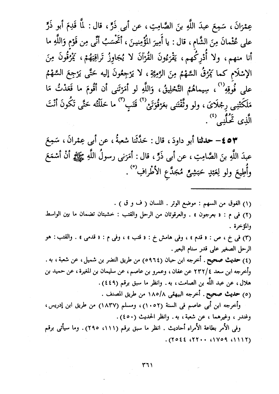 453 - حَدَّثَنَا أَبُو دَاوُدَ قَالَ: حَدَّثَنَا شُعْبَةُ، عَنْ أَبِي عِمْرَانَ، سَمِعَ عَبْدَ اللَّهِ بْنَ الصَّامِتِ، عَنْ أَبِي ذَرٍّ، قَالَ: «أَمَرَنِي رَسُولُ اللَّهِ صَلَّى اللهُ عَلَيْهِ وَسَلَّمَ أَنْ §أَسْمَعَ وَأُطِيعَ وَلَوْ لِعَبْدٍ حَبَشِيٍّ مُجَدَّعِ الْأَطْرَافِ»