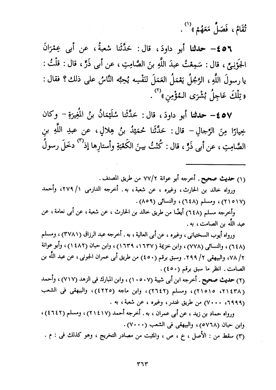 456 - حَدَّثَنَا أَبُو دَاوُدَ قَالَ: حَدَّثَنَا شُعْبَةُ، عَنْ أَبِي عِمْرَانَ الْجَوْنِيِّ، قَالَ: سَمِعْتُ عَبْدَ اللَّهِ بْنَ الصَّامِتِ، عَنْ أَبِي ذَرٍّ، قَالَ: قُلْتُ: يَا رَسُولَ اللَّهِ، الرَّجُلُ يَعْمَلُ الْعَمَلَ لِنَفْسِهِ يُحِبُّهُ النَّاسُ عَلَى ذَلِكَ؟ فَقَالَ: «§تِلْكَ عَاجِلُ بُشْرَى الْمُؤْمِنِ»