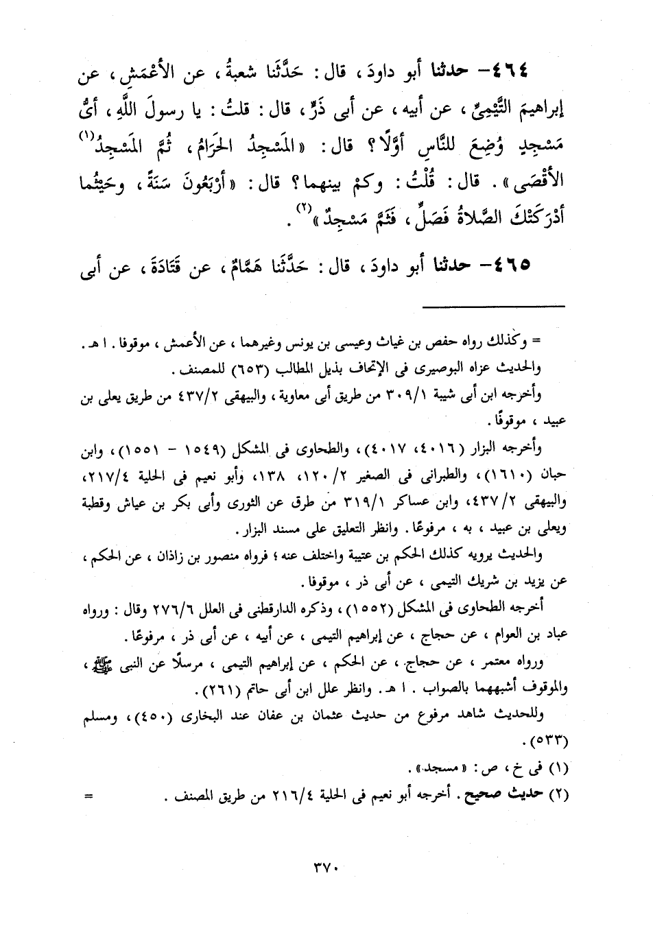 464 - حَدَّثَنَا أَبُو دَاوُدَ قَالَ: حَدَّثَنَا شُعْبَةُ، عَنِ الْأَعْمَشِ، عَنْ إِبْرَاهِيمَ التَّيْمِيِّ، عَنْ أَبِيهِ، عَنْ أَبِي ذَرٍّ، قَالَ: قُلْتُ: يَا رَسُولَ اللَّهِ §أَيُّ مَسْجِدٍ وُضِعَ لِلنَّاسِ أَوَّلًا؟ قَالَ: «الْمَسْجِدُ الْحَرَامُ ثُمَّ الْمَسْجِدُ الْأَقْصَى» ، قَالَ: قُلْتُ: وَكَمْ بَيْنَهُمَا؟ قَالَ: «أَرْبَعُونَ سَنَةً وَحَيْثُمَا أَدْرَكَتْكَ الصَّلَاةُ فَصَلِّ فَثَمَّ مَسْجِدٌ»