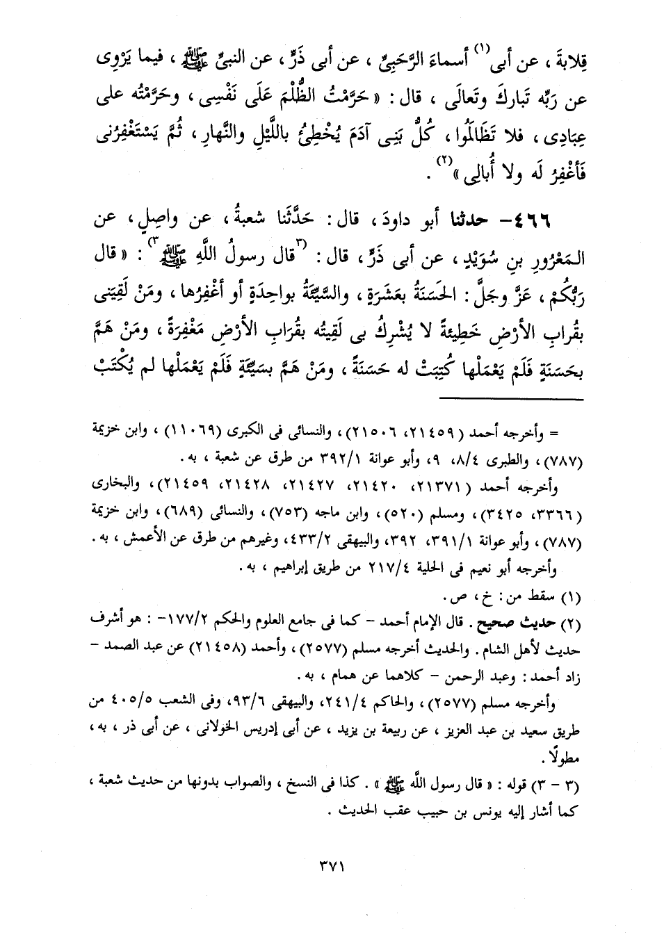 466 - حَدَّثَنَا أَبُو دَاوُدَ قَالَ: حَدَّثَنَا شُعْبَةُ، عَنْ وَاصِلٍ، عَنِ الْمَعْرُورِ بْنِ سُوَيْدٍ، عَنْ أَبِي ذَرٍّ، قَالَ: قَالَ رَسُولُ اللَّهِ صَلَّى اللهُ عَلَيْهِ وَسَلَّمَ: قَالَ رَبُّكُمْ عَزَّ وَجَلَّ: «§الْحَسَنَةُ بِعَشَرَةٍ وَالسَّيِّئَةُ بِوَاحِدَةٍ أَوْ أَغْفِرُهَا، وَمَنْ لَقِيَنِي بِقُرَابِ الْأَرْضِ خَطِيئَةً لَا يُشْرِكُ بِي لَقِيتُهُ بِقُرَابِ الْأَرْضِ مَغْفِرَةً، وَمَنْ هَمَّ بِحَسَنَةٍ فَلَمْ يَعْمَلْهَا كُتِبَتْ لَهُ حَسَنَةٌ وَمَنْ هَمَّ بِسَيِّئَةٍ فَلَمْ يَعْمَلْهَا لَمْ يُكْتَبْ -[372]- عَلَيْهِ شَيْءٌ، وَمَنْ تَقَرَّبَ مِنِّي شِبْرًا تَقَرَّبْتُ مِنْهُ ذِرَاعًا، وَمَنْ تَقَرَّبَ مِنِّي ذِرَاعًا تَقَرَّبْتُ مِنْهُ بَاعًا» لَمْ يَرْفَعْهُ شُعْبَةُ عَنْ وَاصِلٍ وَرَفَعَهُ النَّاسُ عَنِ الْأَعْمَشِ، عَنِ الْمَعْرُورِ