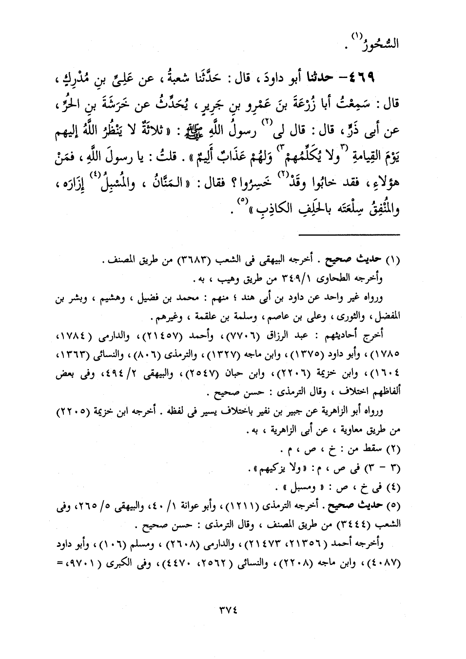 469 - حَدَّثَنَا أَبُو دَاوُدَ قَالَ: حَدَّثَنَا شُعْبَةُ، عَنْ عَلِيِّ بْنِ مُدْرِكٍ، قَالَ: سَمِعْتُ أَبَا زُرْعَةَ بْنَ عَمْرِو بْنِ جَرِيرٍ، يُحَدِّثُ عَنْ خَرَشَةَ بْنِ الْحُرِّ، عَنْ أَبِي ذَرٍّ، قَالَ: قَالَ لِي رَسُولُ اللَّهِ صَلَّى اللهُ عَلَيْهِ وَسَلَّمَ: «§ثَلَاثَةٌ لَا يَنْظُرُ اللَّهُ إِلَيْهِمْ يَوْمَ الْقِيَامَةِ وَلَا يُكَلِّمُهُمْ وَلَهُمْ عَذَابٌ أَلِيمٌ» ، قُلْتُ: يَا رَسُولَ اللَّهِ فَمَنْ هَؤُلَاءِ فَقَدْ خَابُوا وَقَدْ خَسِرُوا؟ فَقَالَ: «الْمَنَّانُ وَالْمُسْبِلُ إِزَارَهُ وَالْمُنَفِّقُ سِلْعَتَهُ بِالْحَلِفِ الْكَاذِبِ»
