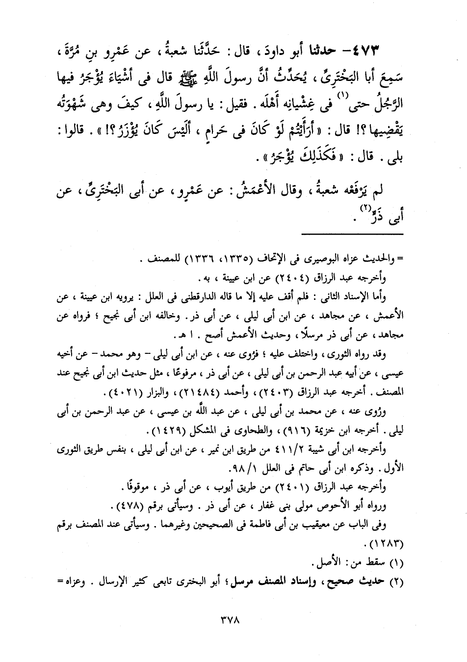 473 - حَدَّثَنَا أَبُو دَاوُدَ قَالَ: حَدَّثَنَا شُعْبَةُ، عَنْ عَمْرِو بْنِ مُرَّةَ، سَمِعَ أَبَا الْبَخْتَرِيِّ، يُحَدِّثُ أَنَّ رَسُولَ اللَّهِ صَلَّى اللهُ عَلَيْهِ وَسَلَّمَ قَالَ فِي أَشْيَاءَ يُؤْجَرُ فِيهَا الرَّجُلُ حَتَّى فِي غِشْيَانِهِ أَهْلَهُ فَقِيلَ: يَا رَسُولَ اللَّهِ كَيْفَ وَهِيَ شَهْوَتُهُ يَقْضِيهَا؟ قَالَ: «§أَرَأَيْتُمْ لَوْ كَانَ فِي حَرَامٍ أَلَيْسَ كَانَ يُؤْزَرُ؟» قَالُوا: بَلَى قَالَ: «فَكَذَلِكَ يُؤْجَرُ» لَمْ يَرْفَعْهُ شُعْبَةُ وَقَالَ الْأَعْمَشُ: عَنْ عَمْرٍو، عَنْ أَبِي الْبَخْتَرِيِّ، عَنْ أَبِي ذَرٍّ