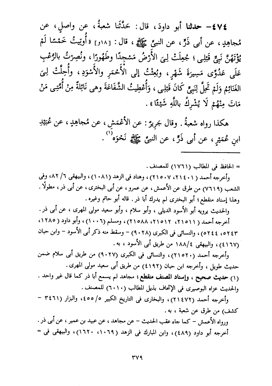 474 - حَدَّثَنَا أَبُو دَاوُدَ قَالَ: حَدَّثَنَا شُعْبَةُ، عَنْ وَاصِلٍ، عَنْ مُجَاهِدٍ، عَنْ أَبِي ذَرٍّ، عَنِ النَّبِيِّ صَلَّى اللهُ عَلَيْهِ وَسَلَّمَ قَالَ: " §أُوتِيتُ خَمْسًا لَمْ يُؤْتَهُنَّ نَبِيٌّ قَبْلِي: جُعِلَتْ لِي الْأَرْضُ مَسْجِدًا وَطَهُورًا وَنُصِرْتُ بِالرُّعْبِ عَلَى عَدُوِّي مَسِيرَةَ شَهْرٍ، وَبُعِثْتُ إِلَى الْأَحْمَرِ وَالْأَسْوَدِ، وَأُحِلَّتْ لِي الْغَنَائِمُ وَلَمْ تَحِلَّ لِنَبِيٍّ كَانَ قَبْلِي، وَأُعْطِيتُ الشَّفَاعَةَ وَهِيَ نَائِلَةٌ مِنْ أُمَّتِي مَنْ مَاتَ مِنْهُمْ لَا يُشْرِكُ بِاللَّهِ شَيْئًا " هَكَذَا رَوَاهُ شُعْبَةُ وَقَالَ جَرِيرٌ، عَنِ الْأَعْمَشِ عَنْ مُجَاهِدٍ عَنْ عُبَيْدِ بْنِ عُمَيْرٍ، عَنْ أَبِي ذَرٍّ عَنِ النَّبِيِّ صَلَّى اللهُ عَلَيْهِ وَسَلَّمَ نَحْوَهُ