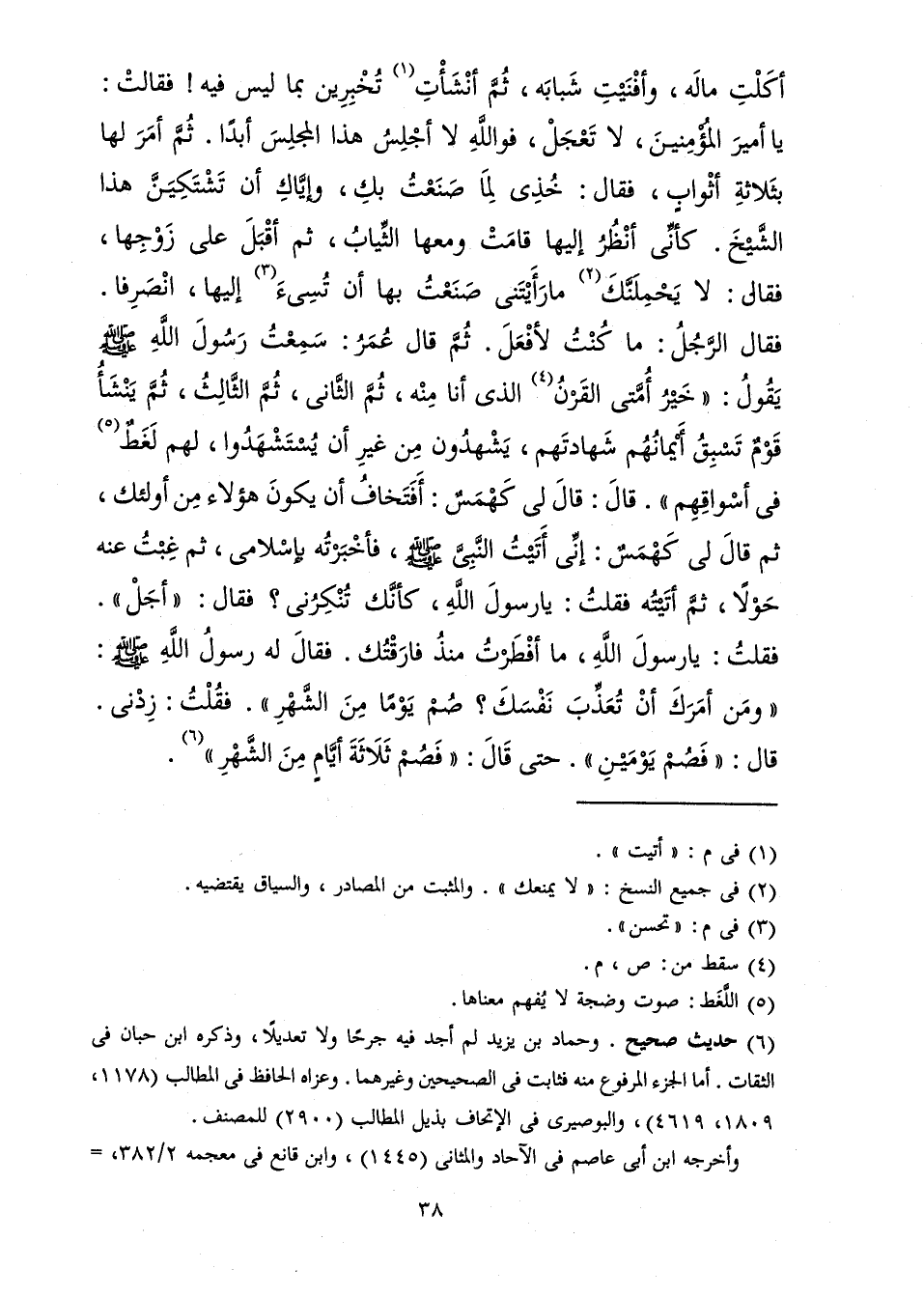 ثُمَّ أَقْبَلَ عَلَى زَوْجِهَا، فَقَالَ: لاَ يَحْمِلَنَّكَ مَا رَأَيْتَنِي صَنَعْتُ بِهَا أَنْ تُسِيءَ إِلَيْهَا، انْصَرَفَا، فَقَالَ الرَّجُلُ: مَا كُنْتُ لأَفْعَلَ، ثُمَّ قَالَ عُمَرُ: سَمِعْتُ رَسُولَ اللهِ صَلَّى الله عَلَيْهِ وَسَلَّمَ يَقُولُ: خَيْرُ أُمَّتِي الْقَرْنُ الَّذِي أَنَا مِنْهُ، ثُمَّ الثَّانِي، ثُمَّ الثَّالِثُ، ثُمَّ يَنْشَأُ قَوْمٌ تَسْبِقُ أَيْمَانُهُمْ شَهَادَتَهُمْ يَشْهَدُونَ مِنْ غَيْرِ أَنْ يُسْتَشْهَدُوا، لَهُمْ لَغَطٌ فِي أَسْوَاقِهِمْ، قَالَ: قَالَ لِي كَهْمَسٌ: أَفَتَخَافُ أَنْ يَكُونَ هَؤُلاَءِ مِنْ أُولَئِكِ، ثُمَّ قَالَ لِي كَهْمَسٌ: إِنِّي أَتَيْتُ النَّبِيَّ صَلَّى الله عَلَيْهِ وَسَلَّمَ فَأَخْبَرْتُهُ بِإِسْلاَمِي، ثُمَّ غِبْتُ عَنْهُ حَوْلاً، ثُمَّ أَتَيْتُهُ، فَقُلْتُ: يَا رَسُولَ اللهِ كَأَنَّكَ تُنْكِرُنِي؟ فَقَالَ: أَجَلْ فَقُلْتُ: يَا رَسُولَ اللهِ، مَا أَفْطَرْتُ مُنْذُ فَارَقْتُكَ، فَقَالَ لَهُ رَسُولُ اللهِ صَلَّى الله عَلَيْهِ وَسَلَّمَ: وَمَنْ أَمَرَكَ أَنْ تُعَذِّبَ نَفْسَكَ، صُمْ يَوْمًا مِنَ الشَّهْرِ، فَقُلْتُ: زِدْنِي قَالَ: فَصُمْ يَوْمَيْنِ، حَتَّى قَالَ: فَصُمْ ثَلاَثَةَ أَيَّامٍ مِنَ الشَّهْرِ.