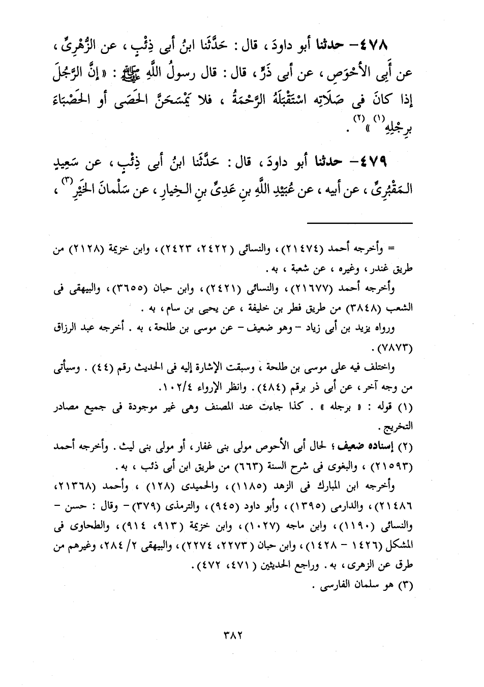 478 - حَدَّثَنَا أَبُو دَاوُدَ قَالَ: حَدَّثَنَا ابْنُ أَبِي ذِئْبٍ، عَنْ الزُّهْرِيِّ، عَنْ أَبِي الْأَحْوَصِ، عَنْ أَبِي ذَرٍّ، قَالَ: قَالَ رَسُولُ اللَّهِ صَلَّى اللهُ عَلَيْهِ وَسَلَّمَ: «إِنَّ §الرَّجُلَ إِذَا كَانَ فِي صَلَاتِهِ اسْتَقْبَلَهُ الرَّحْمَةُ فَلَا يَمْسَحَنَّ الْحَصَى أَوِ الْحَصْبَاءَ بِرِجْلِهِ»