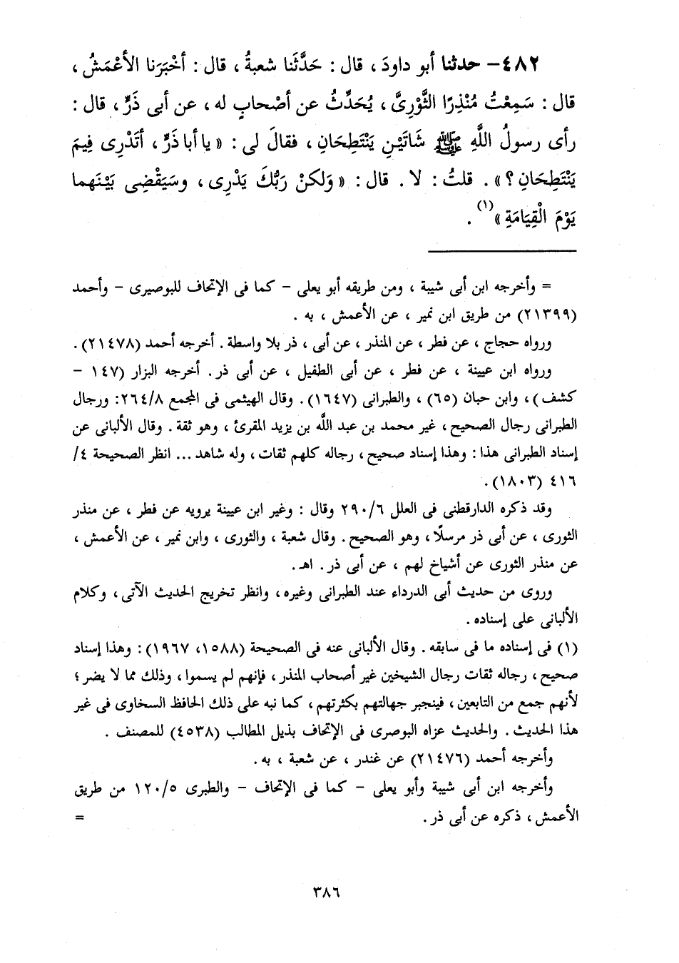 482 - حَدَّثَنَا أَبُو دَاوُدَ قَالَ: حَدَّثَنَا شُعْبَةُ، قَالَ: أَخْبَرَنَا الْأَعْمَشُ، قَالَ: سَمِعْتُ مُنْذِرًا الثَّوْرِيَّ، يُحَدِّثُ عَنْ أَصْحَابٍ لَهُ، عَنْ أَبِي ذَرٍّ، قَالَ: رَأَى رَسُولُ اللَّهِ صَلَّى اللهُ عَلَيْهِ وَسَلَّمَ شَاتَيْنِ يَنْتَطِحَانِ فَقَالَ لِي: «يَا أَبَا ذَرٍّ §أَتَدْرِي فِيمَا يَنْتَطِحَانِ؟» قُلْتُ: لَا، قَالَ: «وَلَكِنْ رَبُّكَ يَدْرِي وَسَيَقْضِي بَيْنَهُمَا يَوْمَ الْقِيَامَةِ»