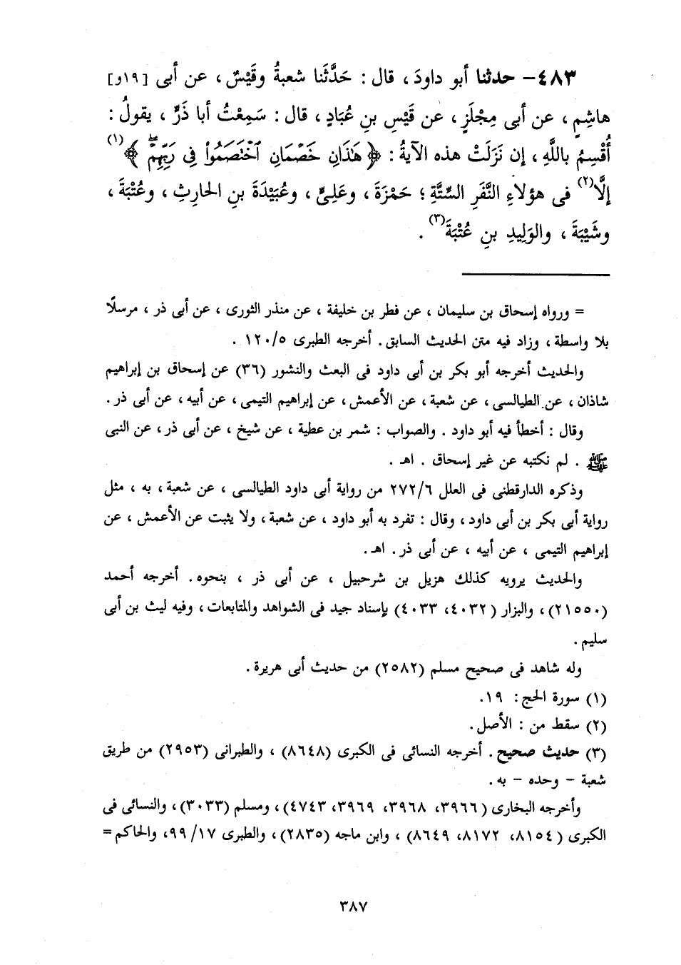 483 - حَدَّثَنَا أَبُو دَاوُدَ قَالَ: حَدَّثَنَا شُعْبَةُ، وَقَيْسٌ، عَنْ أَبِي هَاشِمٍ، عَنْ أَبِي مِجْلَزٍ، عَنْ قَيْسِ بْنِ عُبَادٍ، قَالَ: سَمِعْتُ أَبَا ذَرٍّ، يَقُولُ: " أُقْسِمُ بِاللَّهِ إِنْ §نَزَلَتْ هَذِهِ الْآيَةُ {هَذَانِ خَصْمَانِ اخْتَصَمُوا} [الحج: 19] فِي رَبِّهِمْ إِلَّا فِي هَؤُلَاءِ النَّفَرِ السِّتَّةِ حَمْزَةَ وَعَلِيٍّ وَعُبَيْدَةَ بْنِ الْحَارِثِ وَعُتْبَةَ وَشَيْبَةَ وَالْوَلِيدِ بْنِ عُتْبَةَ "
