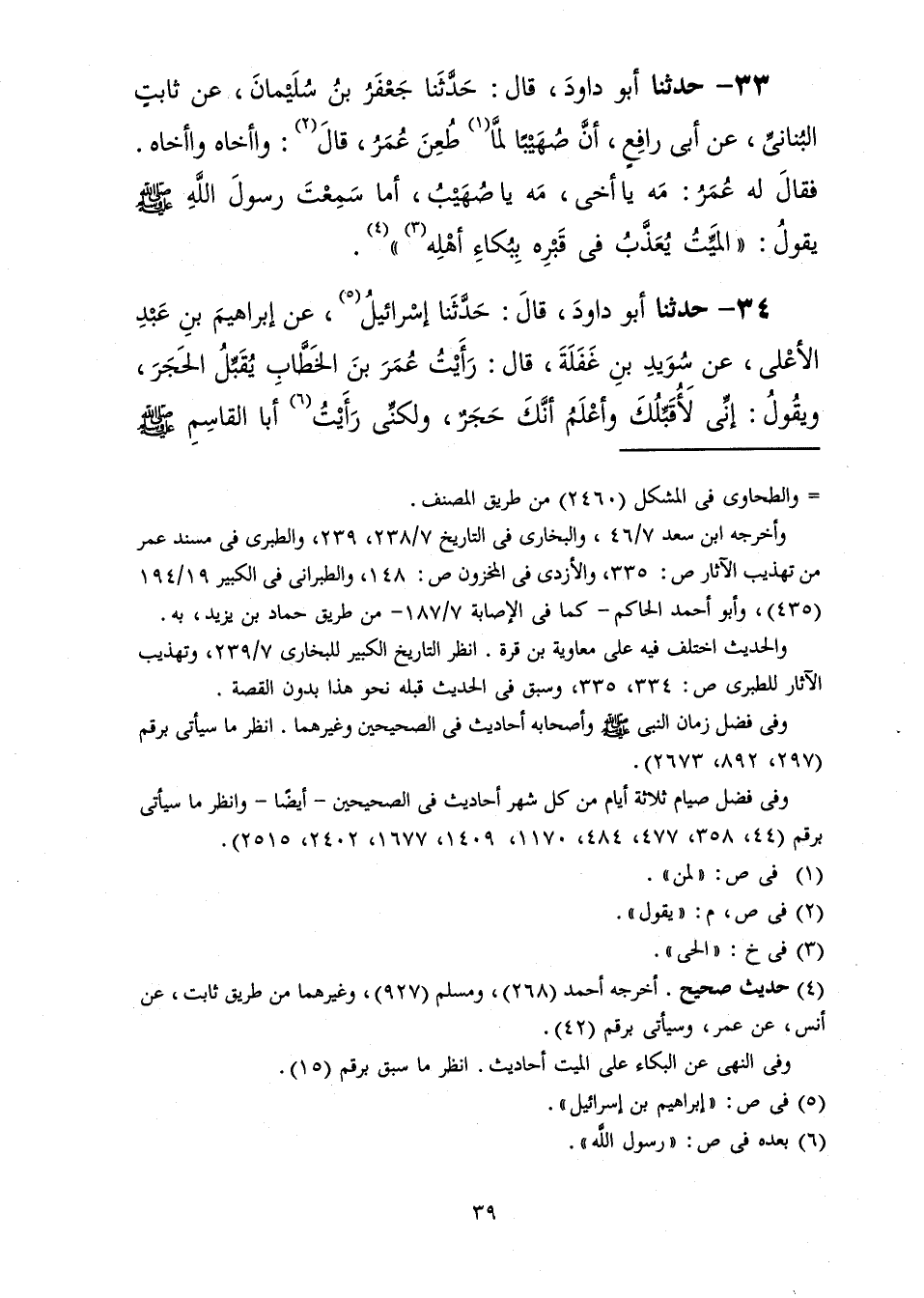 33 - حَدَّثَنَا أَبُو دَاوُدَ قَالَ: حَدَّثَنَا جَعْفَرُ بْنُ سُلَيْمَانَ، عَنْ ثَابِتٍ الْبُنَانِيِّ، عَنْ أَبِي رَافِعٍ، أَنَّ صُهَيْبًا، لَمَّا طُعِنَ عُمَرُ قَالَ: وَاأَخَاهْ وَاأَخَاهْ، فَقَالَ لَهُ عُمَرُ: مَهْ يَا أَخِي مَهْ يَا صُهَيْبُ أَمَا سَمِعْتَ رَسُولَ اللَّهِ صَلَّى اللهُ عَلَيْهِ وَسَلَّمَ يَقُولُ: «§الْمَيِّتُ يُعَذَّبُ فِي قَبْرِهِ بِبُكَاءِ أَهْلِهِ»