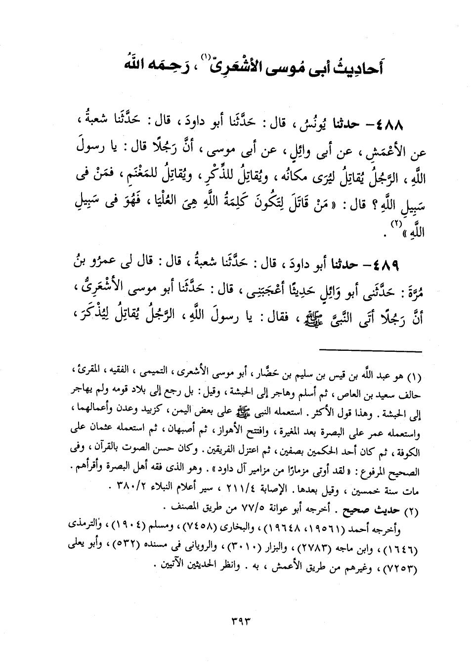 489 - حَدَّثَنَا أَبُو دَاوُدَ قَالَ: حَدَّثَنَا شُعْبَةُ، قَالَ: قَالَ لِي عَمْرُو بْنُ مُرَّةَ، حَدَّثَنِي أَبُو وَائِلٍ حَدِيثًا أَعْجَبَنِي، قَالَ: حَدَّثَنَا أَبُو مُوسَى الْأَشْعَرِيُّ، أَنَّ رَجُلًا أَتَى النَّبِيَّ صَلَّى اللهُ عَلَيْهِ وَسَلَّمَ فَقَالَ: يَا رَسُولَ اللَّهِ الرَّجُلُ يُقَاتِلُ لِيُذْكَرَ -[394]- وَيُقَاتِلُ لِيُرَى مَكَانُهُ وَيُقَاتِلُ لِكَذَا فَمَنْ فِي سَبِيلِ اللَّهِ؟ فَقَالَ رَسُولُ اللَّهِ صَلَّى اللهُ عَلَيْهِ وَسَلَّمَ: «§مَنْ قَاتَلَ لِتَكُونَ كَلِمَةُ اللَّهِ هِيَ أَعْلَى فَهُوَ فِي سَبِيلِ اللَّهِ»
