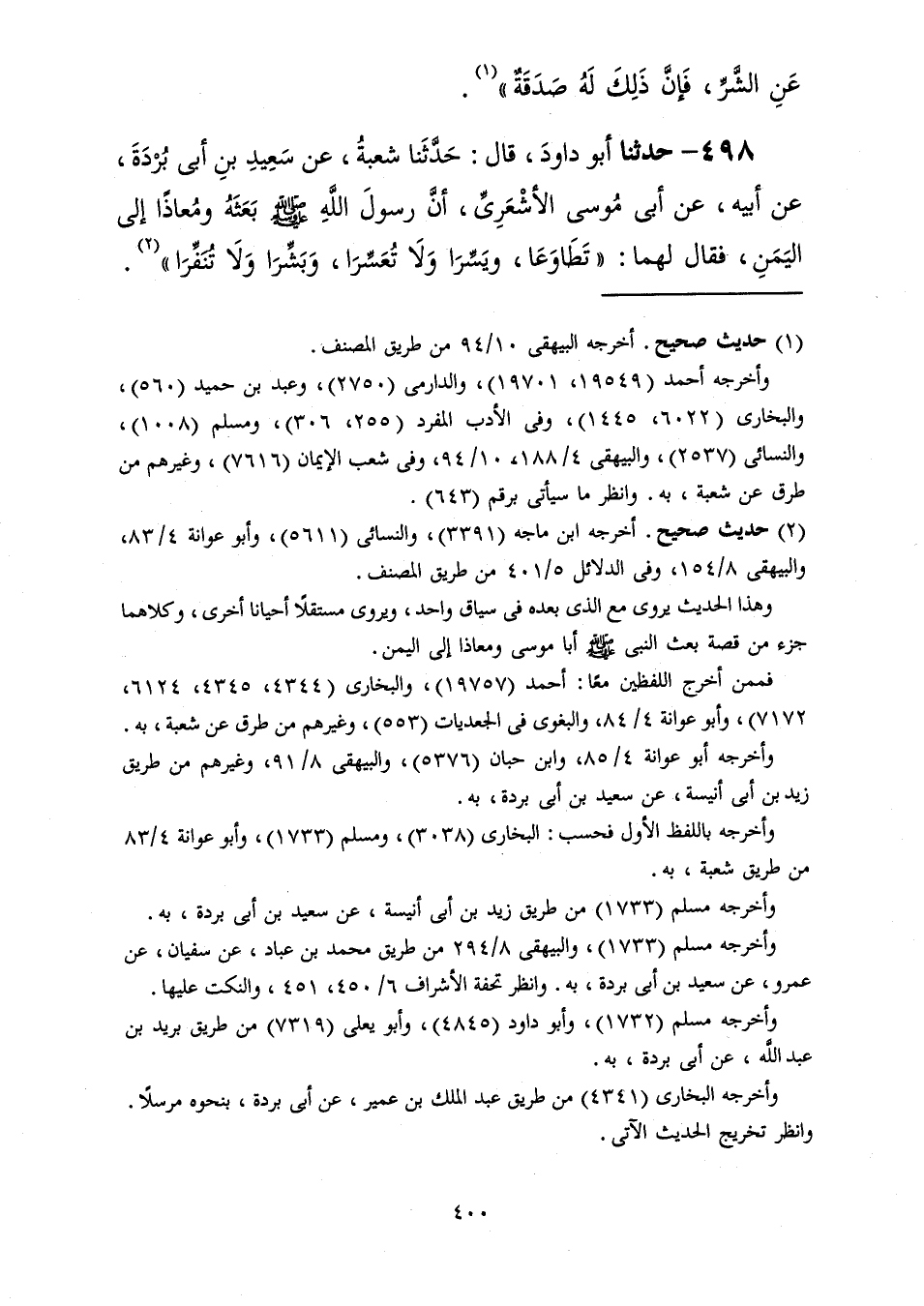 498 - حَدَّثَنَا أَبُو دَاوُدَ قَالَ: حَدَّثَنَا شُعْبَةُ، عَنْ سَعِيدِ بْنِ أَبِي بُرْدَةَ، عَنْ أَبِيهِ، عَنْ أَبِي مُوسَى الْأَشْعَرِيِّ، أَنَّ رَسُولَ اللَّهِ صَلَّى اللهُ عَلَيْهِ وَسَلَّمَ بَعَثَهُ وَمُعَاذًا إِلَى الْيَمَنِ فَقَالَ لَهُمَا: «§تَطَاوَعَا وَيَسِّرَا وَلَا تُعَسِّرَا وَبَشِّرَا وَلَا تُنَفِّرَا»