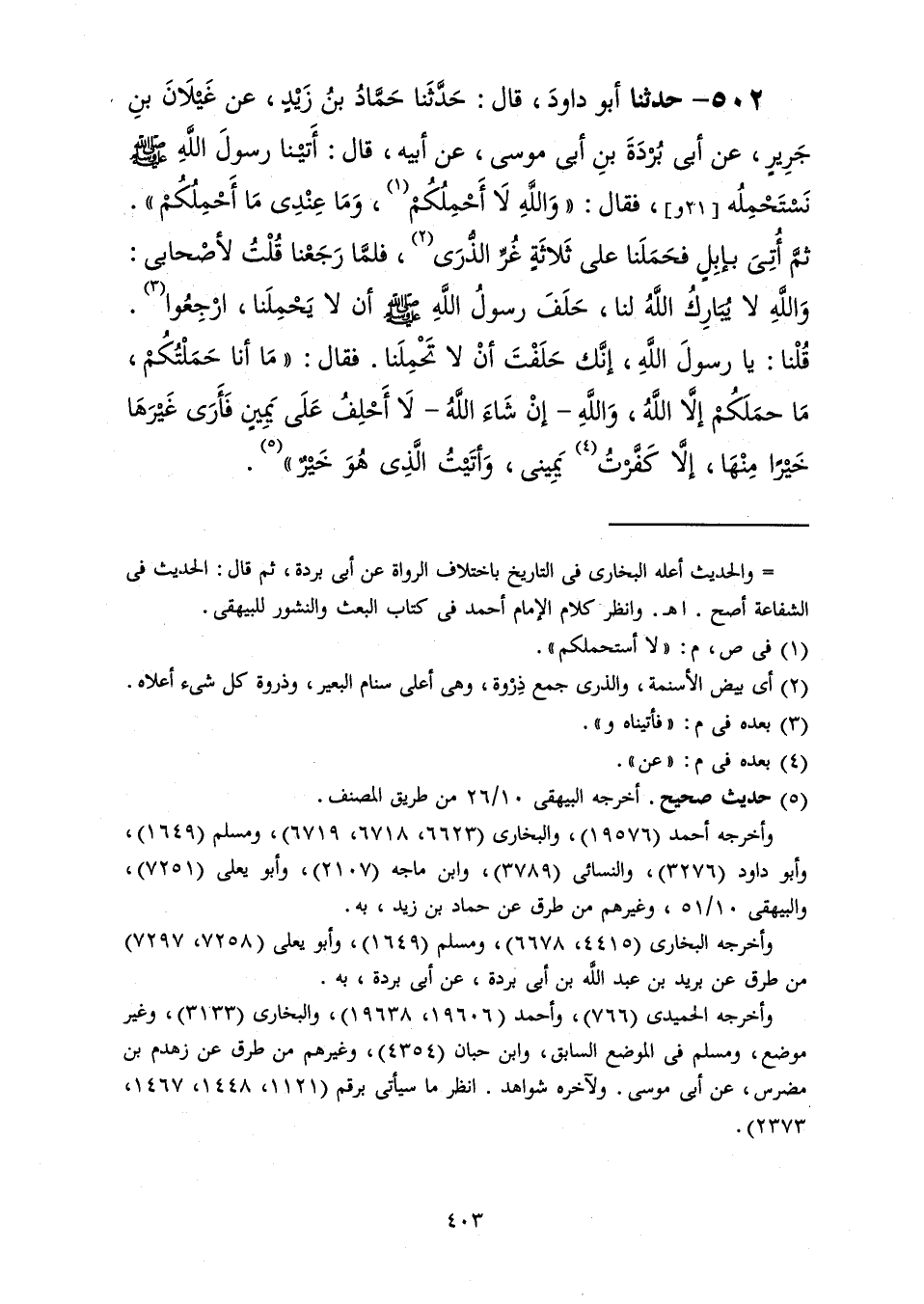 502 - حَدَّثَنَا أَبُو دَاوُدَ قَالَ: حَدَّثَنَا: حَمَّادُ بْنُ زَيْدٍ، عَنْ غَيْلَانَ بْنِ جَرِيرٍ، عَنْ أَبِي بُرْدَةَ بْنِ أَبِي مُوسَى، عَنْ أَبِيهِ، قَالَ: أَتَيْنَا رَسُولَ اللَّهِ صَلَّى اللهُ عَلَيْهِ وَسَلَّمَ نَسْتَحْمِلُهُ فَقَالَ: «وَاللَّهِ لَا أَحْمِلُكُمْ وَمَا عِنْدِي مَا أَحْمِلُكُمْ» ، ثُمَّ أُتِيَ بِإِبِلٍ فَحَمَلَنَا عَلَى ثَلَاثَةٍ غُرِّ الذُّرَى فَلَمَّا رَجَعْنَا قُلْتُ لِأَصْحَابِي: وَاللَّهِ لَا يُبَارَكُ اللَّهُ لَنَا، حَلَفَ رَسُولُ اللَّهِ صَلَّى اللهُ عَلَيْهِ وَسَلَّمَ أَنْ لَا يَحْمِلَنَا ارْجِعُوا، قُلْنَا: يَا رَسُولَ اللَّهِ إِنَّكَ حَلَفْتَ أَنْ لَا تَحْمِلَنَا فَقَالَ: «مَا أَنَا حَمَلْتُكُمْ مَا حَمَلَكُمْ إِلَّا اللَّهُ، وَاللَّهِ إِنْ شَاءَ اللَّهُ §لَا أَحْلِفُ عَلَى يَمِينٍ فَأَرَى غَيْرَهَا خَيْرًا مِنْهَا إِلَّا كَفَّرْتُ يَمِينِي وَأَتَيْتُ الَّذِي هُوَ خَيْرٌ»
