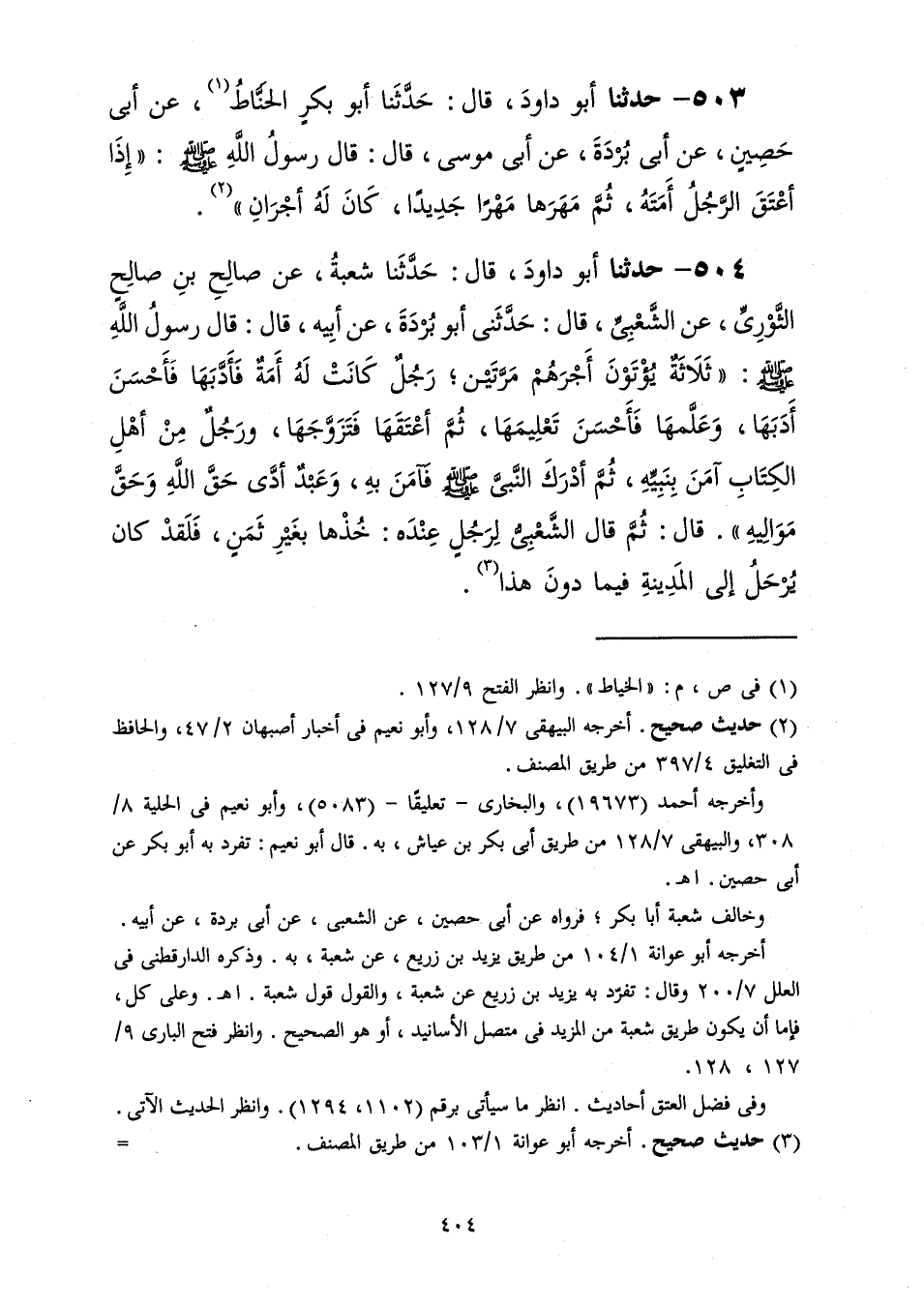 504 - حَدَّثَنَا أَبُو دَاوُدَ قَالَ: حَدَّثَنَا شُعْبَةُ، عَنْ صَالِحِ بْنِ صَالِحٍ الثَّوْرِيِّ، عَنِ الشَّعْبِيِّ، قَالَ: حَدَّثَنِي أَبُو بُرْدَةَ، عَنْ أَبِيهِ، قَالَ: قَالَ رَسُولُ اللَّهِ صَلَّى اللهُ عَلَيْهِ وَسَلَّمَ: «§ثَلَاثَةٌ يُؤْتَوْنَ أُجْرَهُمْ مَرَّتَيْنِ رَجُلٌ كَانَتْ لَهُ أَمَةٌ فَأَدَّبَهَا فَأَحْسَنَ أَدَبَهَا وَعَلَّمَهَا فَأَحْسَنَ تَعْلِيمَهَا ثُمَّ أَعْتَقَهَا فَتَزَوَّجَهَا، وَرَجُلٌ مِنْ أَهْلِ الْكِتَابِ آمَنَ بِنَبِيِّهِ ثُمَّ أَدْرَكَ النَّبِيَّ صَلَّى اللهُ عَلَيْهِ وَسَلَّمَ فَآمَنَ بِهِ، وَعَبْدٌ أَدَّى حَقَّ اللَّهِ وَحَقَّ مَوَالِيهِ» ، قَالَ: ثُمَّ قَالَ الشَّعْبِيُّ لِرَجُلٍ عِنْدَهُ: خُذْهَا بِغَيْرِ ثَمَنٍ فَلَقَدْ كَانَ يُرْحَلُ إِلَى الْمَدِينَةِ فِيمَا دُونَ هَذَا