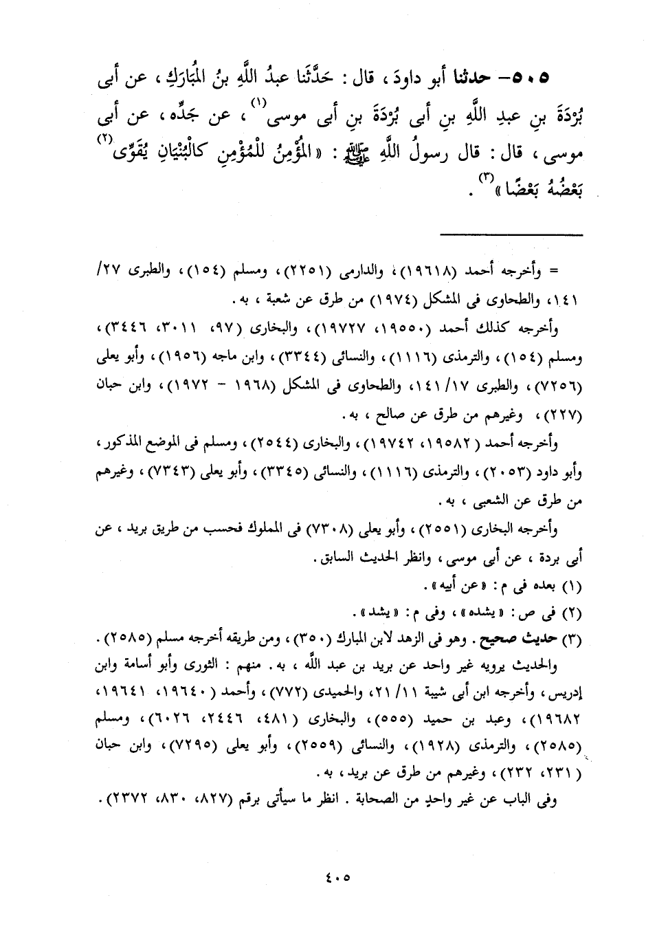 505 - حَدَّثَنَا أَبُو دَاوُدَ قَالَ: حَدَّثَنَا عَبْدُ اللَّهِ بْنُ الْمُبَارَكِ، عَنْ أَبِي بُرْدَةَ بْنِ عَبْدِ اللَّهِ بْنِ أَبِي بُرْدَةَ بْنِ أَبِي مُوسَى، عَنْ، عَنْ جَدِّهِ عَنْ أَبِي مُوسَى، قَالَ: قَالَ رَسُولُ اللَّهِ صَلَّى اللهُ عَلَيْهِ وَسَلَّمَ: «§الْمُؤْمِنُ لِلْمُؤْمِنِ كَالْبُنْيَانِ يَقَوِّي بَعْضُهُ بَعْضًا»