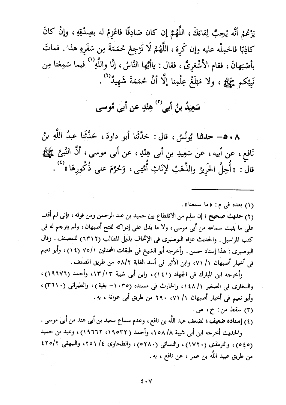 508 - حَدَّثَنَا يُونُسُ قَالَ: حَدَّثَنَا أَبُو دَاوُدَ، حَدَّثَنَا عَبْدُ اللَّهِ بْنُ نَافِعٍ، عَنْ أَبِيهِ، عَنْ سَعِيدِ بْنِ أَبِي هِنْدٍ، عَنْ أَبِي مُوسَى، أَنَّ النَّبِيَّ صَلَّى اللهُ عَلَيْهِ وَسَلَّمَ قَالَ: «§أُحِلَّ الْحَرِيرُ وَالذَّهَبُ لِإِنَاثِ أُمَّتِي وَحُرِّمَ عَلَى ذُكُورِهَا»