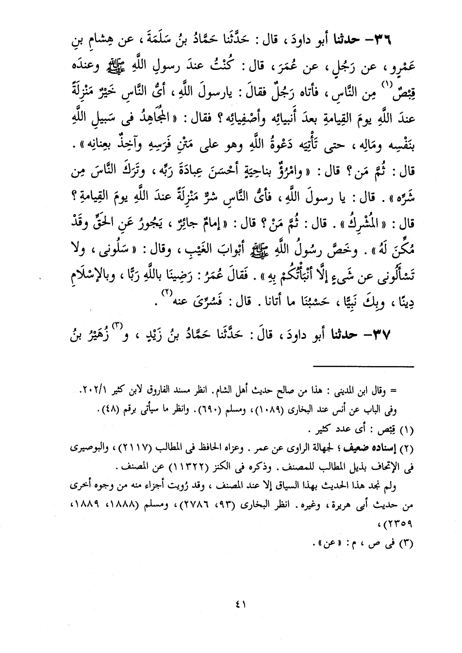 36 - حَدَّثَنَا أَبُو دَاوُدَ قَالَ: حَدَّثَنَا حَمَّادُ بْنُ سَلَمَةَ، عَنْ هِشَامِ بْنِ عَمْرٍو، عَنْ رَجُلٍ، عَنْ عُمَرَ، قَالَ: كُنْتُ عِنْدَ رَسُولِ اللَّهِ صَلَّى اللهُ عَلَيْهِ وَسَلَّمَ وَعِنْدَهُ قِبْصٌ مِنَ النَّاسِ فَأَتَاهُ رَجُلٌ فَقَالَ: يَا رَسُولَ اللَّهِ §أَيُّ النَّاسِ خَيْرٌ مَنْزِلَةً عِنْدَ اللَّهِ يَوْمَ الْقِيَامَةِ بَعْدَ أَنْبِيَائِهِ وَأَصْفِيَائِهِ؟ فَقَالَ: «الْمُجَاهِدُ فِي سَبِيلِ اللَّهِ بِنَفْسِهِ وَمَالِهِ حَتَّى تَأْتِيَهُ دَعْوَةُ اللَّهِ وَهُوَ عَلَى مَتْنِ فَرَسِهِ وَآخِذٌ بِعِنَانِهِ» ، قَالَ: ثُمَّ مَنْ؟ قَالَ: «وَامْرُؤٌ بِنَاحِيَةٍ أَحْسَنَ عِبَادَةَ رَبِّهِ وَتَرَكَ النَّاسَ مِنْ شَرِّهِ» ، قَالَ: يَا رَسُولَ اللَّهِ فَأَيُّ النَّاسِ شَرٌّ مَنْزِلَةً عِنْدَ اللَّهِ يَوْمَ الْقِيَامَةِ؟ قَالَ: «الْمُشْرِكُ» ، قَالَ: ثُمَّ مَنْ؟ قَالَ: «إِمَامٌ جَائِرٌ يَجُورُ عَنِ الْحَقِّ وَقَدْ مُكِّنَ لَهُ» ، وَخَصَّ رَسُولُ اللَّهِ صَلَّى اللهُ عَلَيْهِ وَسَلَّمَ أَبْوَابَ الْغَيْبِ وَقَالَ: «سَلُونِي وَلَا تَسْأَلُونِي عَنْ شَيْءٍ إِلَّا أَنْبَأْتُكُمْ بِهِ» ، فَقَالَ عُمَرُ: رَضِينَا بِاللَّهِ رَبًّا وَبِالْإِسْلَامِ دِينًا وَبِكَ نَبِيًّا حَسْبُنَا مَا أَتَانَا قَالَ فَسُرِّيَ عَنْهُ