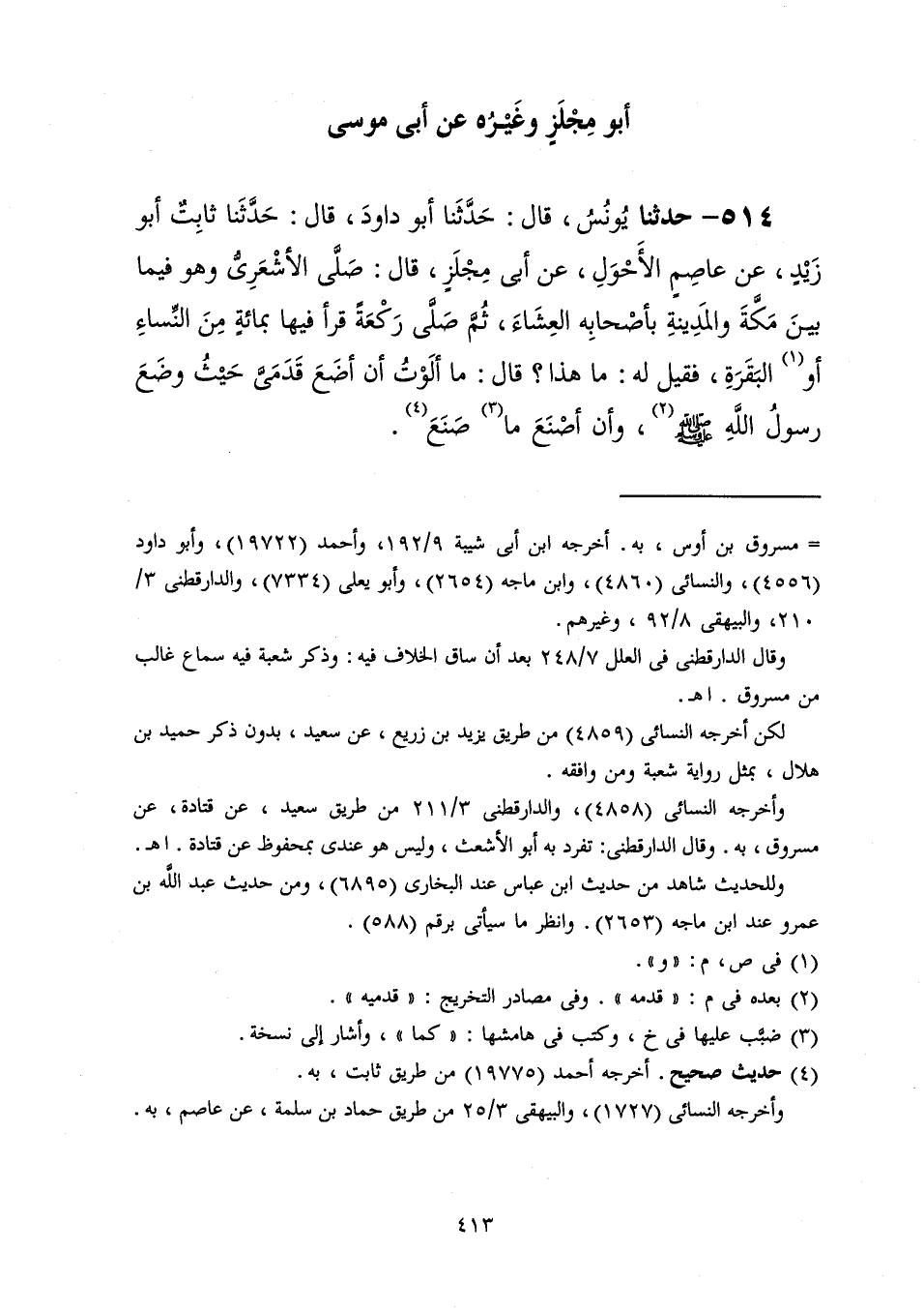 514 - حَدَّثَنَا يُونُسُ قَالَ: حَدَّثَنَا أَبُو دَاوُدَ قَالَ: حَدَّثَنَا ثَابِتٌ أَبُو زَيْدٍ، عَنْ عَاصِمٍ الْأَحْوَلِ، عَنْ أَبِي مِجْلَزٍ، قَالَ: صَلَّى الْأَشْعَرِيُّ وَهُوَ فِيمَا بَيْنَ مَكَّةَ وَالْمَدِينَةِ بِأَصْحَابِهِ الْعِشَاءَ ثُمَّ §صَلَّى رَكْعَةً قَرَأَ فِيهَا بِمِائَةٍ مِنَ النِّسَاءِ، أَوِ الْبَقَرَةِ، فَقِيلَ لَهُ: مَا هَذَا؟ قَالَ: «مَا أَلَوْتُ أَنْ أَضَعَ قَدَمَيَّ حَيْثُ وَضَعَ رَسُولُ اللَّهِ صَلَّى اللهُ عَلَيْهِ وَسَلَّمَ وَأَنْ أَصْنَعَ مَا صَنَعَ»