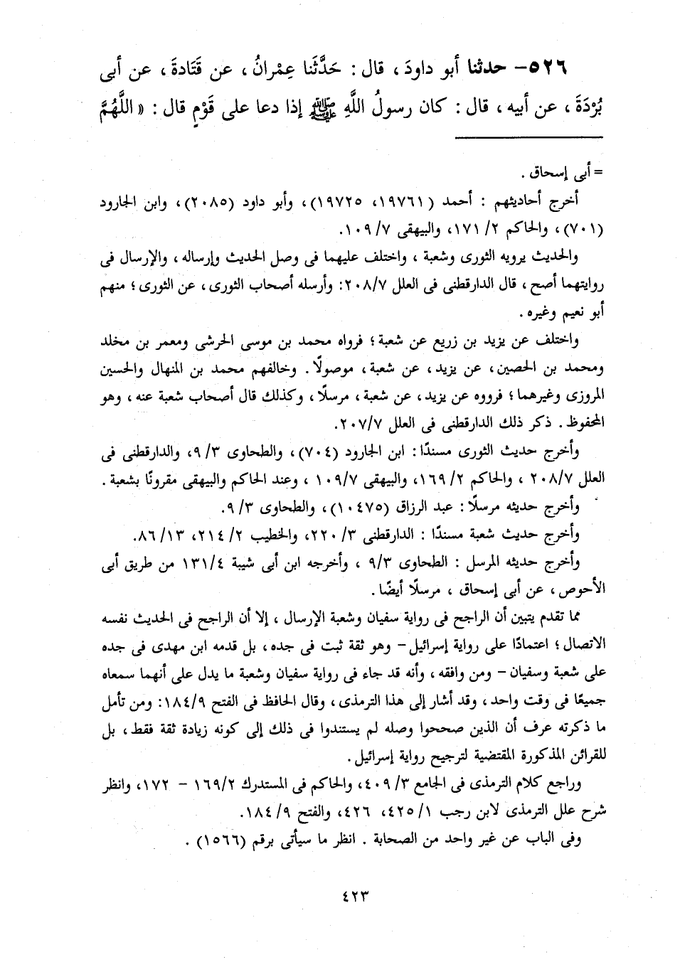 526 - حَدَّثَنَا أَبُو دَاوُدَ قَالَ: حَدَّثَنَا عِمْرَانُ، عَنْ قَتَادَةَ، عَنْ أَبِي بُرْدَةَ، عَنْ أَبِيهِ، قَالَ: كَانَ رَسُولُ اللَّهِ صَلَّى اللهُ عَلَيْهِ وَسَلَّمَ إِذَا دَعَا عَلَى قَوْمٍ قَالَ: «§اللَّهُمَّ -[424]- إِنِّي أَجْعَلُكَ فِي نُحُورِهِمْ وَأَعُوذُ بِكَ مِنْ شُرُورِهِمْ»