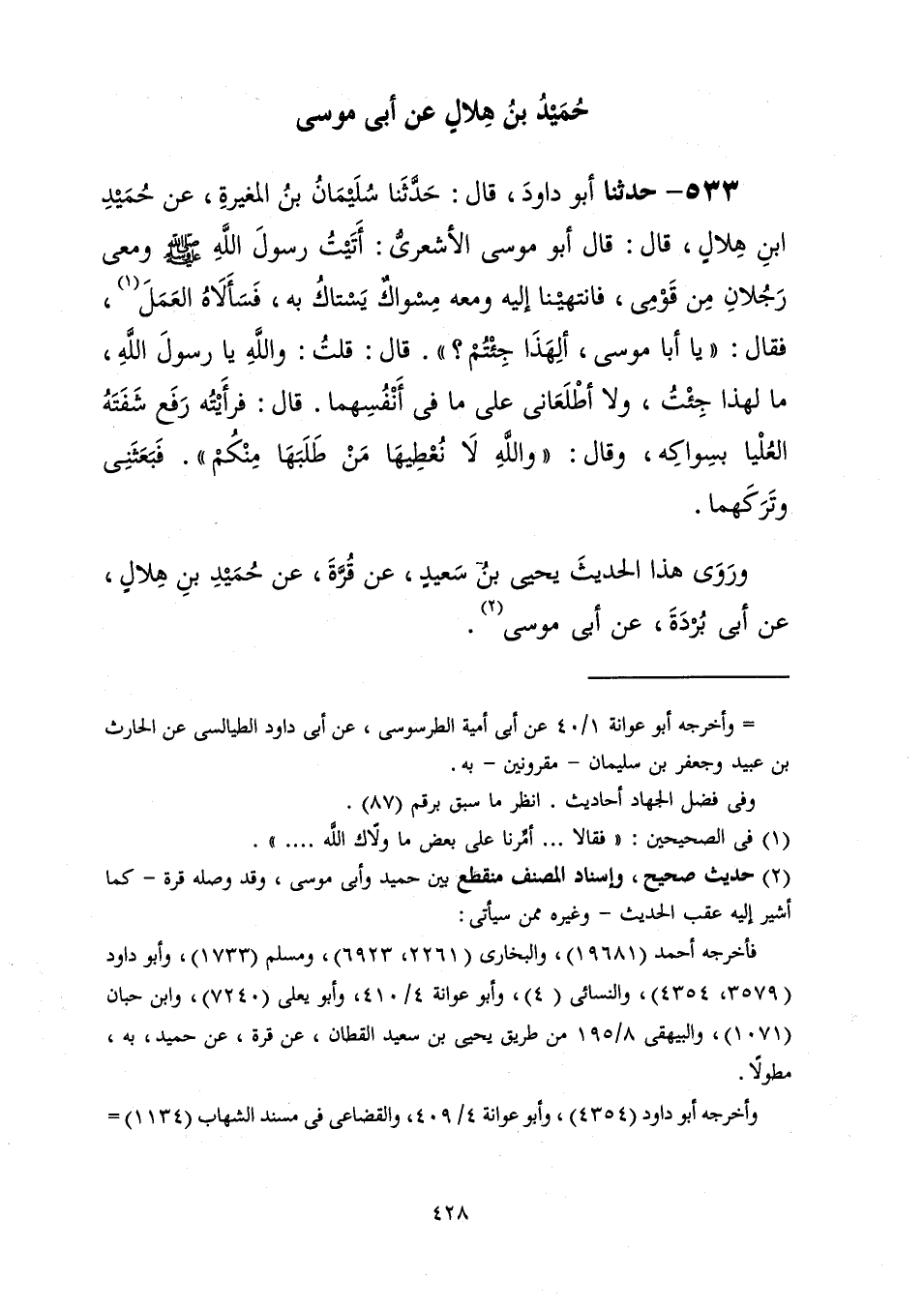 533 - حَدَّثَنَا أَبُو دَاوُدَ قَالَ: حَدَّثَنَا سُلَيْمَانُ بْنُ الْمُغِيرَةِ، عَنْ حُمَيْدِ بْنِ هِلَالٍ، قَالَ: قَالَ أَبُو مُوسَى الْأَشْعَرِيُّ: أَتَيْتُ رَسُولَ اللَّهِ صَلَّى اللهُ عَلَيْهِ وَسَلَّمَ وَمَعِي رَجُلَانِ مِنْ قَوْمِي فَانْتَهَيْنَا إِلَيْهِ وَمَعَهُ مِسْوَاكٌ يَسْتَاكُ بِهِ فَسَأَلَاهُ الْعَمَلَ فَقَالَ: «يَا أَبَا مُوسَى أَلِهَذَا جِئْتُمْ؟» قَالَ: قُلْتُ: وَاللَّهِ يَا رَسُولَ اللَّهِ مَا لِهَذَا جِئْتُ وَلَا أَطْلَعَانِي عَلَى مَا فِي أَنْفُسِهِمَا قَالَ: فَرَأَيْتُهُ رَفَعَ شَفَتَهُ الْعُلْيَا بِسِوَاكِهِ وَقَالَ: «وَاللَّهِ §لَا نُعْطِيهَا مَنْ طَلَبَهَا مِنْكُمْ» ، فَبَعَثَنِي وَتَرْكَهُمَا وَرَوَى هَذَا الْحَدِيثَ يَحْيَى بْنُ سَعِيدٍ، عَنْ قُرَّةَ عَنْ حُمَيْدِ بْنِ هِلَالٍ، عَنْ أَبِي بُرْدَةَ عَنْ أَبِي مُوسَى