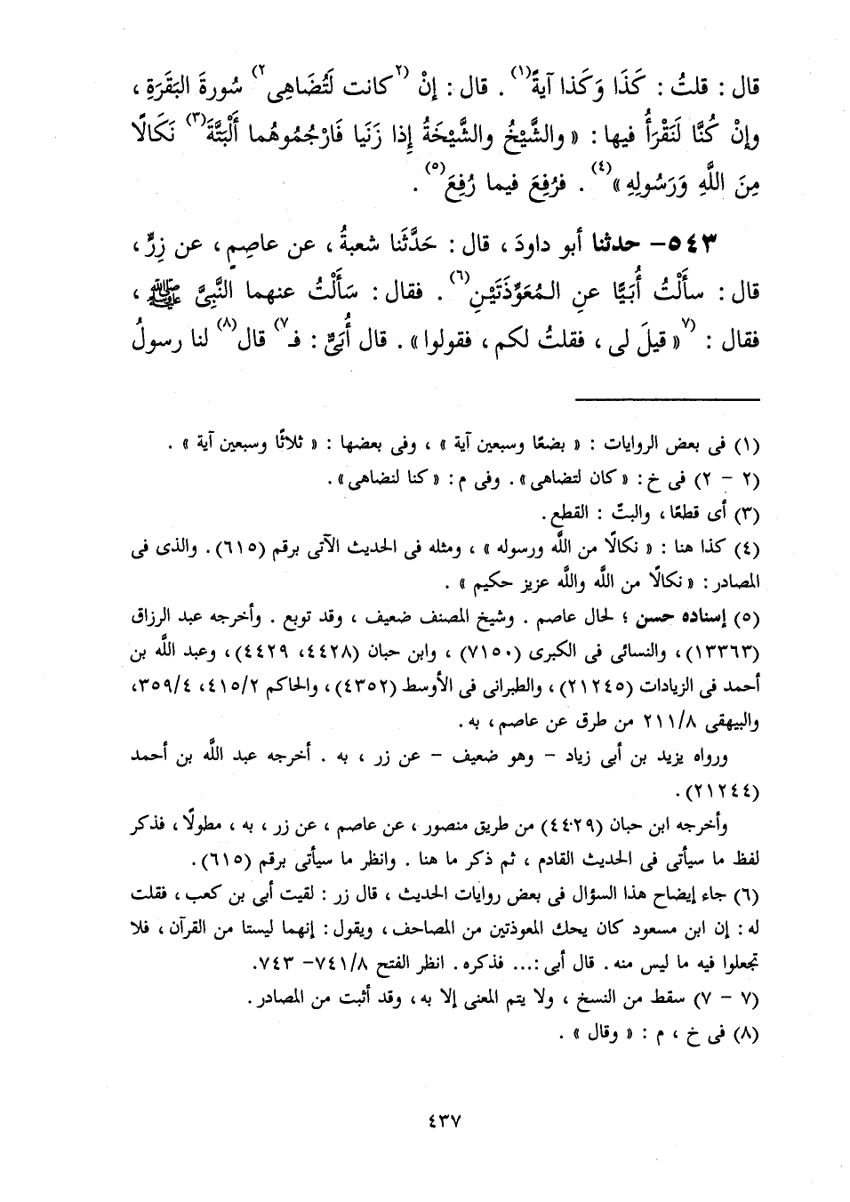 543 - حَدَّثَنَا أَبُو دَاوُدَ قَالَ: حَدَّثَنَا شُعْبَةُ، عَنْ عَاصِمٍ، عَنْ زِرٍّ، قَالَ: سَأَلْتُ أُبَيًّا عَنِ الْمُعَوِّذَتَيْنِ، فَقَالَ: سَأَلْتُ عَنْهُمَا النَّبِيَّ صَلَّى اللهُ عَلَيْهِ وَسَلَّمَ فَقَالَ: «§قِيلَ لِي فَقُلْتُ لَكُمْ فَقُولُوا» ، قَالَ أُبَيٌّ: فَقَالَ لَنَا -[438]- رَسُولُ اللَّهِ صَلَّى اللهُ عَلَيْهِ وَسَلَّمَ وَنَحْنُ نَقُولُ