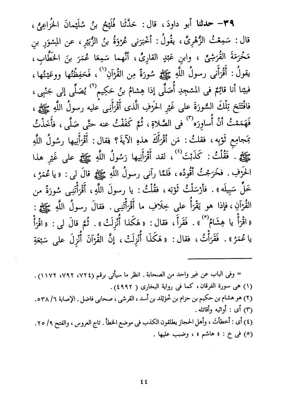 39 - حَدَّثَنَا أَبُو دَاوُدَ قَالَ: حَدَّثَنَا فُلَيْحُ بْنُ سُلَيْمَانَ الْخُزَاعِيُّ، قَالَ: سَمِعْتُ الزُّهْرِيَّ، يَقُولُ: أَخْبَرَنِي عُرْوَةُ بْنُ الزُّبَيْرِ، عَنِ الْمِسْوَرِ بْنِ مَخْرَمَةَ الْقُرَشِيِّ، وَابْنِ عَبْدٍ الْقَارِيِّ، أَنَّهُمَا سَمِعَا عُمَرَ بْنَ الْخَطَّابِ يَقُولُ: أَقْرَأَنِي رَسُولُ اللَّهِ صَلَّى اللهُ عَلَيْهِ وَسَلَّمَ سُورَةً مِنَ الْقُرْآنِ فَحَفِظْتُهَا وَوَعَيْتُهَا فَبَيْنَا أَنَا قَائِمٌ فِي الْمَسْجِدِ أُصَلِّي إِذَا هِشَامُ بْنُ حَكِيمٍ يُصَلِّي إِلَى جَنْبِي فَافْتَتَحَ تِلْكَ السُّورَةَ عَلَى غَيْرِ الْحَرْفِ الَّذِي أَقْرَأَنِي عَلَيْهِ رَسُولُ اللَّهِ صَلَّى اللهُ عَلَيْهِ وَسَلَّمَ فَهَمَمْتُ أَنْ أُسَاوِرَهُ فِي الصَّلَاةِ ثُمَّ كَفَفْتُ عَنْهُ حَتَّى صَلَّى فَأَخَذْتُ بِمَجَامِعِ ثَوْبِهِ فَقُلْتُ: مَنْ أَقْرَأَكَ هَذِهِ الْآيَةَ؟ فَقَالَ: أَقْرَأَنِيهَا رَسُولُ اللَّهِ صَلَّى اللهُ عَلَيْهِ وَسَلَّمَ فَقُلْتُ: كَذَبْتَ لَقَدْ أَقْرَأَنِيهَا رَسُولُ اللَّهِ صَلَّى اللهُ عَلَيْهِ وَسَلَّمَ عَلَى غَيْرِ هَذَا الْحَرْفِ فَخَرَجْتُ أَقُودُهُ فَلَمَّا رَآنِي رَسُولُ اللَّهِ صَلَّى اللهُ عَلَيْهِ وَسَلَّمَ قَالَ لِي: «يَا عُمَرُ خَلِّ سَبِيلَهُ» ، فَأَرْسَلْتُ ثَوْبَهُ فَقُلْتُ: يَا رَسُولَ اللَّهِ أَقْرَأْتَنِي سُورَةً مِنَ الْقُرْآنِ فَإِذَا هُوَ يَقْرَأُ عَلَى خِلَافِ مَا أَقْرَأْتَنِي فَقَالَ رَسُولُ اللَّهِ صَلَّى اللهُ عَلَيْهِ وَسَلَّمَ: «اقْرَأْ يَا هِشَامُ» ، فَقَرَأَ فَقَالَ: «هَكَذَا أُنْزِلَتْ» ، ثُمَّ قَالَ لِي: «اقْرَأْ يَا عُمَرُ» ، فَقَرَأْتُ فَقَالَ: «هَكَذَا أُنْزِلَتْ، إِنَّ §الْقُرْآنَ أُنْزِلَ عَلَى سَبْعَةِ -[45]- أَحْرُفٍ فَاقْرَءُوا مَا تَيَسَّرَ مِنْهُ»