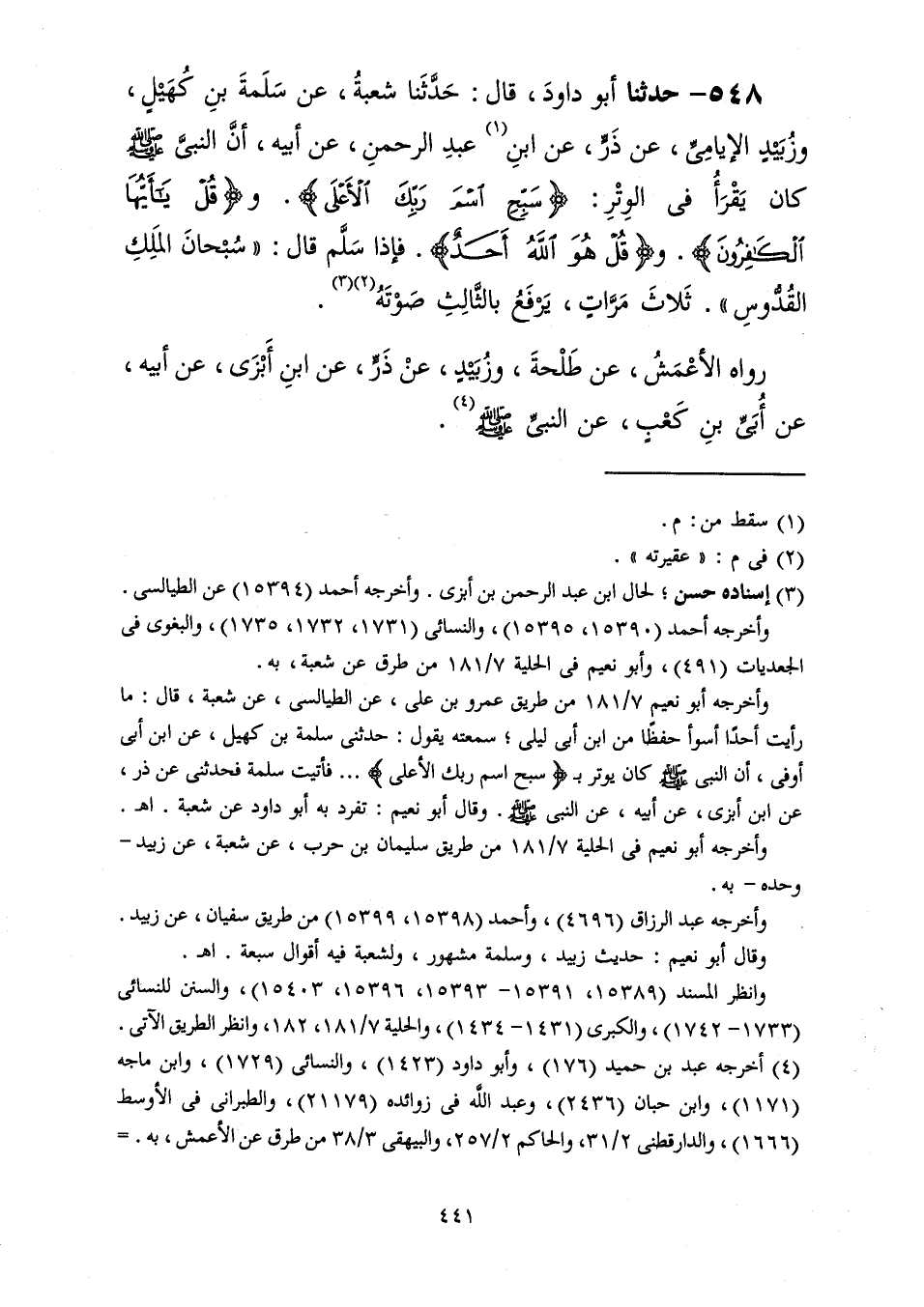 548 - حَدَّثَنَا أَبُو دَاوُدَ قَالَ: حَدَّثَنَا شُعْبَةُ، عَنْ سَلَمَةَ بْنِ كُهَيْلٍ، وَزُبَيْدٍ الْإِيَامِيِّ، عَنْ ذَرٍّ، عَنْ ابْنِ عَبْدِ الرَّحْمَنِ، عَنْ أَبِيهِ، أَنَّ النَّبِيَّ صَلَّى اللهُ عَلَيْهِ وَسَلَّمَ كَانَ §يَقْرَأُ فِي الْوِتْرِ سَبِّحِ اسْمَ رَبِّكِ الْأَعْلَى، وَقُلْ يَا أَيُّهَا الْكَافِرُونَ، وَقُلْ هُوَ اللَّهُ أَحَدٌ فَإِذَا سَلَّمَ قَالَ: «سُبْحَانَ الْمَلِكِ الْقُدُّوسِ» ثَلَاثَ مَرَّاتٍ يَرْفَعُ بِالثَّالِثِ صَوْتَهُ رَوَاهُ الْأَعْمَشُ عَنْ طَلْحَةَ وَزُبَيْدٍ عَنْ ذَرٍّ، عَنْ ابْنِ أَبْزَى، عَنْ أَبِيهِ، عَنْ أُبَيِّ بْنِ كَعْبٍ عَنِ النَّبِيِّ صَلَّى اللهُ عَلَيْهِ وَسَلَّمَ