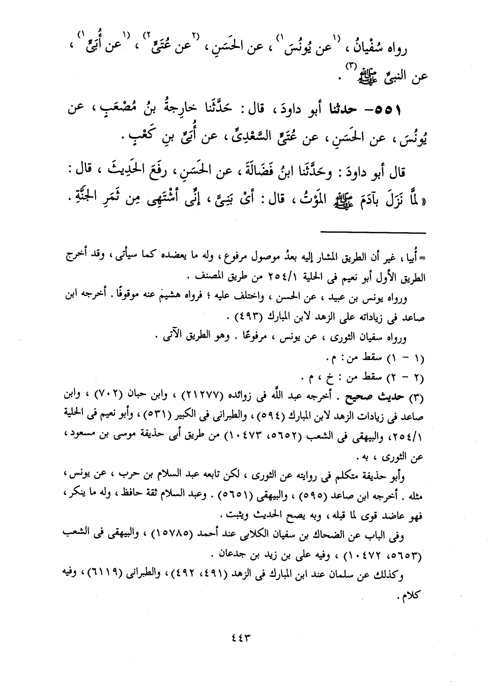 551 - حَدَّثَنَا أَبُو دَاوُدَ قَالَ: حَدَّثَنَا خَارِجَةُ بْنُ مُصْعَبٍ، عَنْ يُونُسَ، عَنِ الْحَسَنِ، عَنْ عُتَيٍّ السَّعْدِيِّ، عَنْ أُبَيِّ بْنِ كَعْبٍ، وَحَدَّثَنَا ابْنُ فَضَالَةَ، عَنِ الْحَسَنِ، رَفَعَ الْحَدِيثَ قَالَ: " §لَمَّا نَزَلَ بِآدَمَ صَلَّى اللهُ عَلَيْهِ وَسَلَّمَ الْمَوْتُ قَالَ: أَيْ بَنِيَّ، إِنِّي أَشْتَهِي مِنْ ثَمَرِ الْجَنَّةِ -[444]- فَانْطَلَقَ بَنُوهُ يَلْتَمِسُونَ فَرَأَوُا الْمَلَائِكَةَ فَقَالُوا: أَيْنَ تُرِيدُونَ يَا بَنِي آدَمَ؟ فَقَالُوا: اشْتَهَى أَبُونَا مِنْ ثَمَرَةِ الْجَنَّةِ فَانْطَلَقْنَا نَطْلُبُ ذَلِكَ لَهُ فَقَالَ: ارْجِعُوا فَقَدْ أُمِرَ بِقَبْضِ أَبِيكُمْ فَأَقْبَلُوا حَتَّى انْتَهَوْا إِلَى آدَمَ صَلَّى اللهُ عَلَيْهِ وَسَلَّمَ فَلَمَّا رَأَتْهُمْ حَوَّاءُ عَرَفْتُهُمْ فَلَصِقَتْ بِآدَمَ فَقَالَ: إِلَيْكِ عَنِّي فَمِنْ قِبَلِكِ أُتِيتُ دَعِينِي وَمَلَائِكَةَ رَبِّي، قَالَ: فَقَبَضُوهُ وَهُمْ يَنْظُرُونَ وَغَسَّلُوهُ وَهُمْ يَنْظُرُونَ وَكَفَّنُوهُ وَهُمْ يَنْظُرُونَ وَحَنَّطُوهُ وَهُمْ يَنْظُرُونَ وَصَلَّوْا عَلَيْهِ ثُمَّ أَقْبَلُوا عَلَيْهِمْ فَقَالُوا: يَا بَنِي آدَمَ هَذِهِ سُنَّتُكُمْ فِي مَوْتَاكُمْ وَهَذَا سَبِيلُكُمْ "