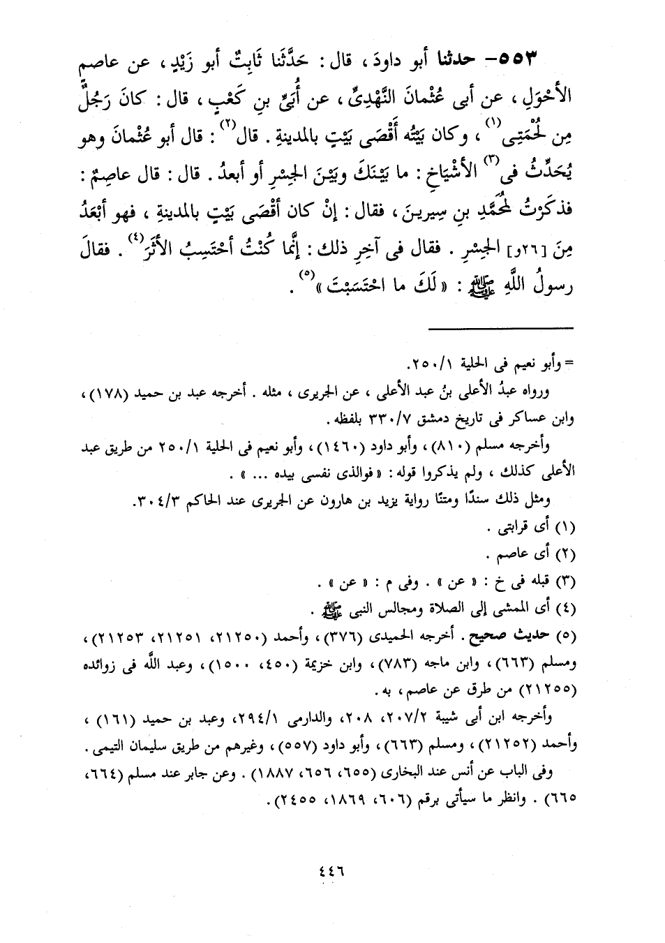 553 - حَدَّثَنَا أَبُو دَاوُدَ قَالَ: حَدَّثَنَا ثَابِتٌ أَبُو زَيْدٍ، عَنْ عَاصِمٍ الْأَحْوَلِ، عَنْ أَبِي عُثْمَانَ النَّهْدِيِّ، عَنْ أُبَيِّ بْنِ كَعْبٍ، قَالَ: كَانَ رَجُلٌ مِنْ لُحْمَتِي وَكَانَ بَيْتُهُ أَقْصَى بَيْتٍ بِالْمَدِينَةِ قَالَ: قَالَ أَبُو عُثْمَانَ: وَهُوَ يُحَدِّثُ فِي الْأَشْيَاخِ: مَا بَيْنَكَ وَبَيْنَ الْجِسْرِ أَوْ أَبْعَدُ قَالَ: قَالَ عَاصِمٌ: فَذَكَرْتُ لِمُحَمَّدِ بْنِ سِيرِينَ فَقَالَ: إِنْ كَانَ أَقْصَى بَيْتٍ بِالْمَدِينَةِ فَهُوَ أَبْعَدُ مِنَ الْجِسْرِ فَقَالَ فِي آخِرِ ذَلِكَ: إِنَّمَا كُنْتُ أَحْتَسِبُ الْأَثَرَ فَقَالَ رَسُولُ اللَّهِ صَلَّى اللهُ عَلَيْهِ وَسَلَّمَ: «§لَكَ مَا احْتَسَبْتَ»