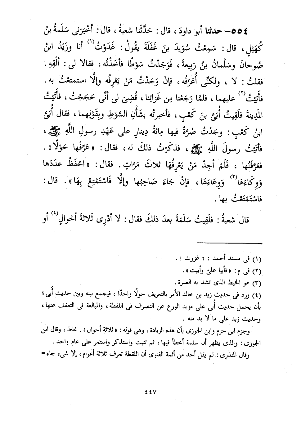 554 - حَدَّثَنَا أَبُو دَاوُدَ قَالَ: حَدَّثَنَا شُعْبَةُ، قَالَ: أَخْبَرَنِي سَلَمَةُ بْنُ كُهَيْلٍ، قَالَ: سَمِعْتُ سُوَيْدَ بْنَ غَفَلَةَ، يَقُولُ: غَدَوْتُ أَنَا وَزَيْدُ بْنُ صُوحَانَ، وَسَلْمَانُ بْنُ رَبِيعَةَ، فَوَجَدْتُ سَوْطًا فَأَخَذْتُهُ فَقَالَ لِي: أَلْقِهِ فَقُلْتُ: لَا وَلَكِنِّي أُعَرِّفُهُ فَإِنْ وَجَدْتُ مَنْ يَعْرِفُهُ وَإِلَّا اسْتَمْتَعْتُ بِهِ فَأَبَيْتُ عَلَيْهِمَا فَلَمَّا رَجَعْنَا مِنْ غَزَاتِنَا قُضِيَ لِي أَنِّي حَجَجْتُ فَأَتَيْتُ الْمَدِينَةَ فَلَقِيتُ أُبَيَّ بْنَ كَعْبٍ فَأَخْبَرْتُهُ بِشَأْنِ السَّوْطِ وَبِقَوْلِهِمَا، فَقَالَ أُبَيُّ بْنُ كَعْبٍ: وَجَدْتُ صُرَّةً فِيهَا مِائَةُ دِينَارٍ عَلَى عَهْدِ رَسُولِ اللَّهِ صَلَّى اللهُ عَلَيْهِ وَسَلَّمَ فَأَتَيْتُ رَسُولَ اللَّهِ صَلَّى اللهُ عَلَيْهِ وَسَلَّمَ فَذَكَرْتُ ذَلِكَ لَهُ فَقَالَ: «§عَرِّفْهَا حَوْلًا» ، فَعَرَّفْتُهَا فَلَمْ أَجِدْ مَنْ يَعْرِفُهَا ثَلَاثَ مَرَّاتٍ فَقَالَ: «احْفَظْ عَدَدَهَا وَوِكَاءَهَا وَوِعَاءَهَا فَإِنْ جَاءَ صَاحِبُهَا وَإِلَّا فَاسْتَمْتِعْ بِهَا» ، قَالَ: فَاسْتَمْتَعْتُ بِهَا قَالَ شُعْبَةُ: فَلَقِيتُ سَلَمَةَ بَعْدَ ذَلِكَ فَقَالَ: لَا أَدْرِي ثَلَاثَةَ أَحْوَالٍ أَوْ -[448]- حَوْلًا وَاحِدًا فَأَعْجَبَنِي هَذَا الْحَدِيثُ فَقُلْتُ لِأَبِي صَادِقٍ: تَعَالَ فَاسْمَعْهُ مِنْهُ