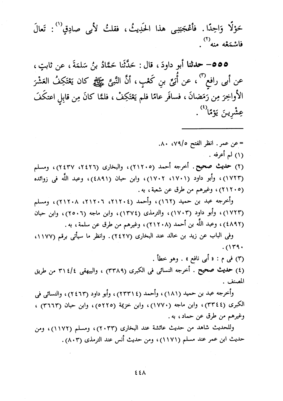 555 - حَدَّثَنَا أَبُو دَاوُدَ قَالَ: حَدَّثَنَا حَمَّادُ بْنُ سَلَمَةَ، عَنْ ثَابِتٍ، عَنْ أَبِي رَافِعٍ، عَنْ أُبَيِّ بْنِ كَعْبٍ، أَنَّ النَّبِيَّ صَلَّى اللهُ عَلَيْهِ وَسَلَّمَ «كَانَ §يَعْتَكِفُ الْعَشْرَ الْأَوَاخِرَ مِنْ رَمَضَانَ فَسَافَرَ عَامًا فَلَمْ يَعْتَكِفْ فَلَمَّا كَانَ مِنْ قَابِلٍ اعْتَكَفَ عِشْرِينَ يَوْمًا»