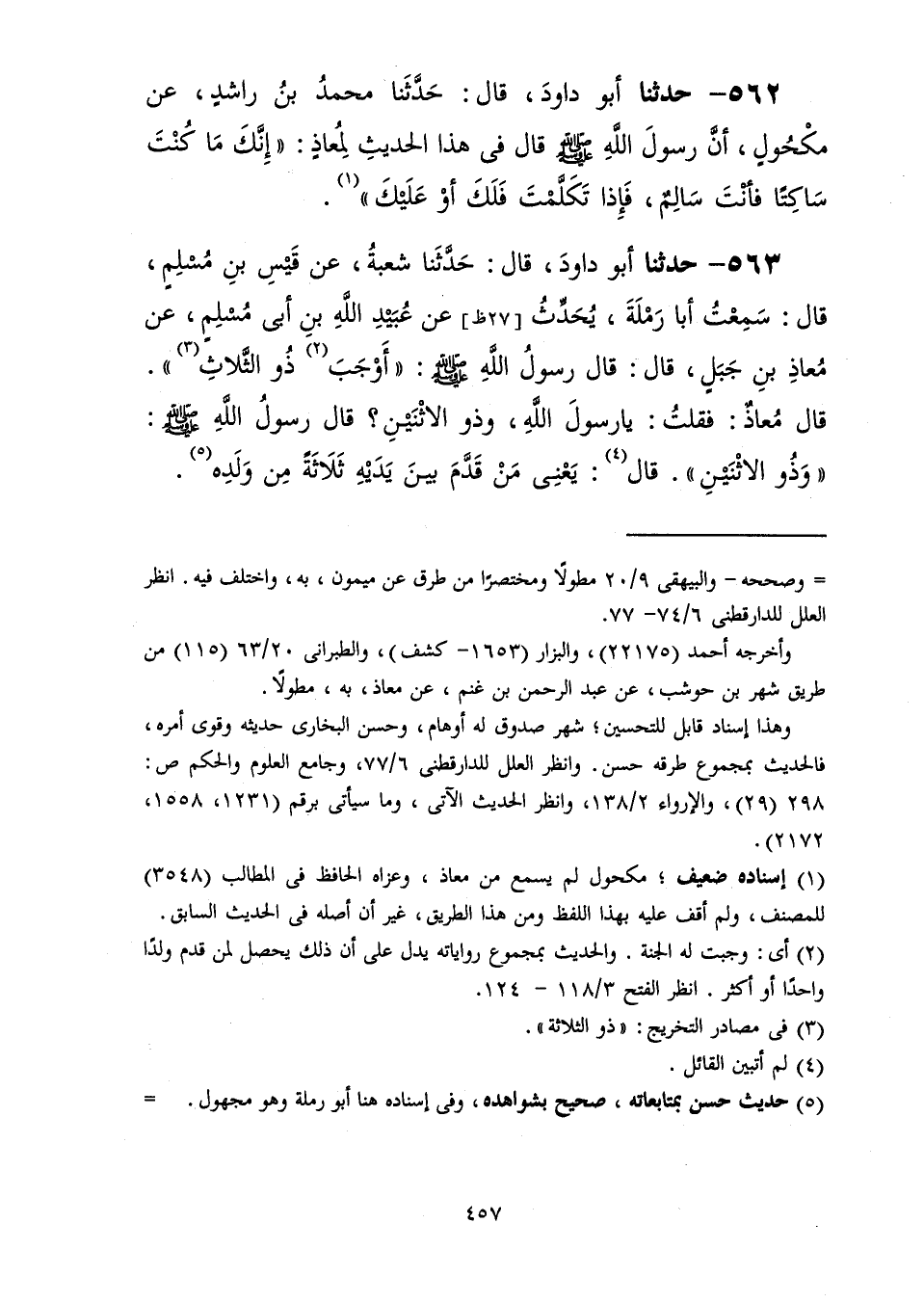 562 - حَدَّثَنَا أَبُو دَاوُدَ قَالَ: حَدَّثَنَا مُحَمَّدُ بْنُ رَاشِدٍ، عَنْ مَكْحُولٍ، أَنَّ رَسُولَ اللَّهِ صَلَّى اللهُ عَلَيْهِ وَسَلَّمَ قَالَ فِي هَذَا الْحَدِيثِ لِمُعَاذٍ: «إِنَّكَ §مَا كُنْتَ سَاكِتًا فَأَنْتَ سَالِمٌ فَإِذَا تَكَلَّمْتَ فَلَكَ أَوْ عَلَيْكَ»