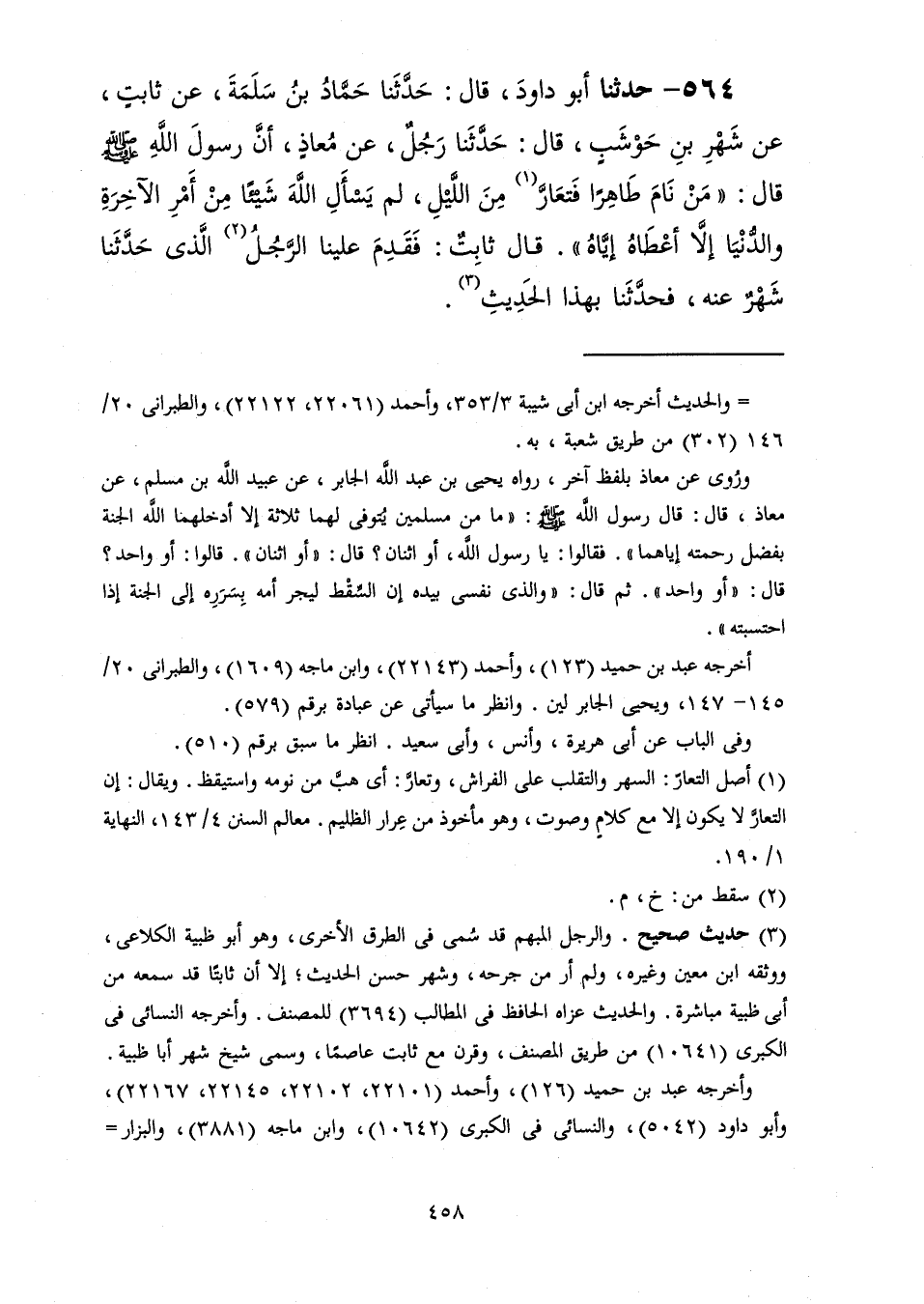 564 - حَدَّثَنَا أَبُو دَاوُدَ قَالَ: حَدَّثَنَا حَمَّادُ بْنُ سَلَمَةَ، عَنْ ثَابِتٍ، عَنْ شَهْرِ بْنِ حَوْشَبٍ، قَالَ: حَدَّثَنَا رَجُلٌ، عَنْ مُعَاذٍ، أَنَّ رَسُولَ اللَّهِ صَلَّى اللهُ عَلَيْهِ وَسَلَّمَ قَالَ: «§مَنْ نَامَ طَاهِرًا فَتَعَارَّ مِنَ اللَّيْلِ لَمْ يَسْأَلِ اللَّهَ شَيْئًا مِنْ أَمْرِ الْآخِرَةِ وَالدُّنْيَا إِلَّا أَعْطَاهُ إِيَّاهُ» ، قَالَ ثَابِتٌ: فَقَدِمَ عَلَيْنَا الرَّجُلُ الَّذِي حَدَّثَنَا شَهْرٌ عَنْهُ فَحَدَّثَنَا بِهَذَا الْحَدِيثِ