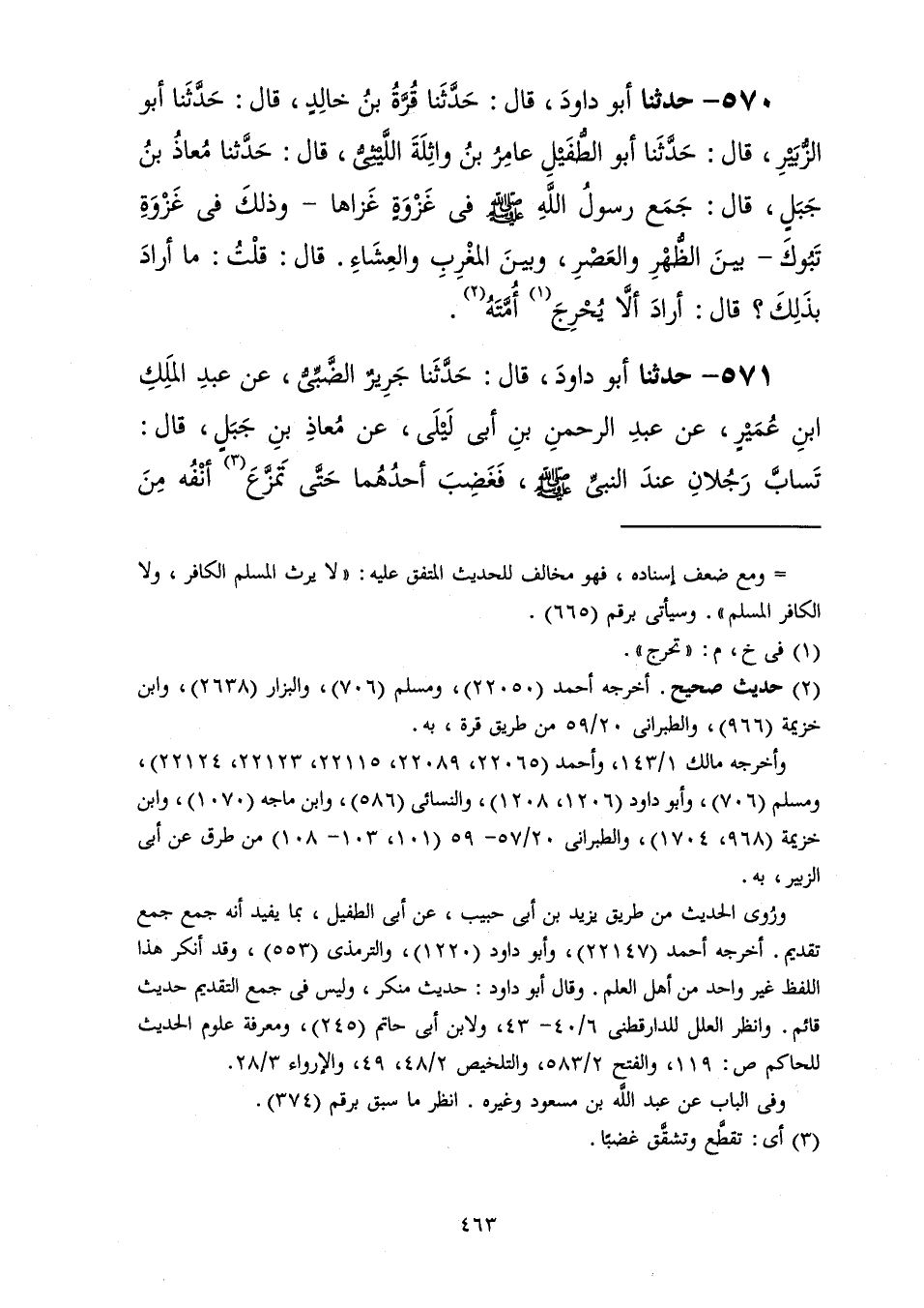 570 - حَدَّثَنَا أَبُو دَاوُدَ قَالَ: حَدَّثَنَا قُرَّةُ بْنُ خَالِدٍ، قَالَ: حَدَّثَنَا أَبُو الزُّبَيْرِ، قَالَ: حَدَّثَنَا أَبُو الطُّفَيْلِ عَامِرُ بْنُ وَاثِلَةَ اللَّيْثِيُّ، قَالَ: حَدَّثَنَا مُعَاذُ بْنُ جَبَلٍ، قَالَ: «§جَمَعَ رَسُولُ اللَّهِ صَلَّى اللهُ عَلَيْهِ وَسَلَّمَ فِي غَزْوَةٍ غَزَاهَا - وَذَلِكَ فِي غَزْوَةِ تَبُوكَ - بَيْنَ الظُّهْرِ وَالْعَصْرِ وَبَيْنَ الْمَغْرِبِ وَالْعِشَاءِ» ، قَالَ: قُلْتُ: مَا أَرَادَ بِذَلِكَ قَالَ: أَرَادَ أَلَّا يُحْرِجَ أُمَّتَهُ